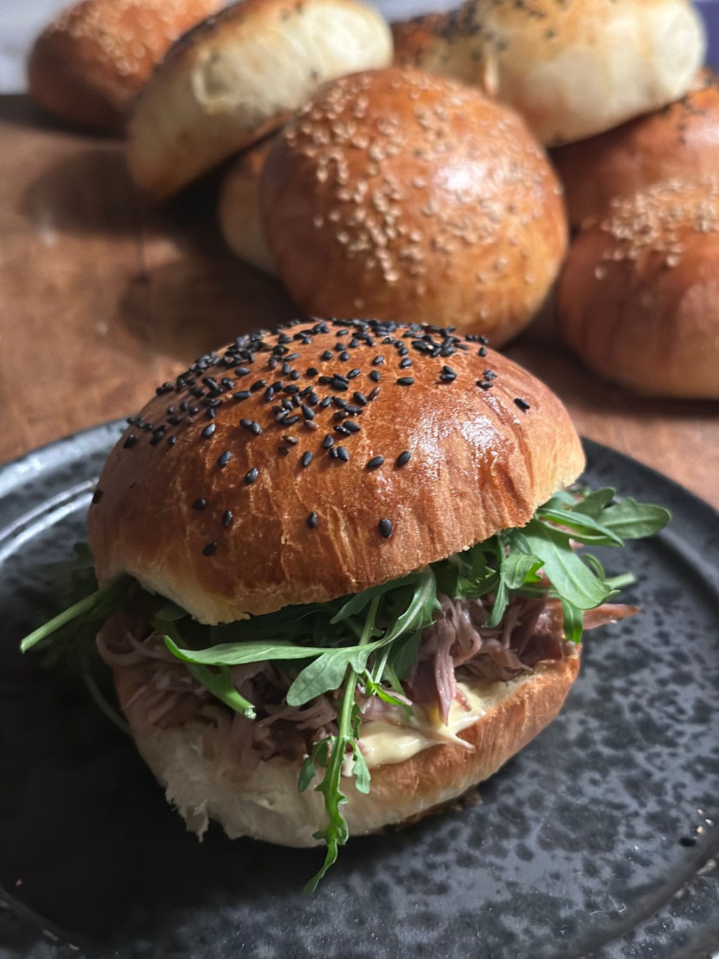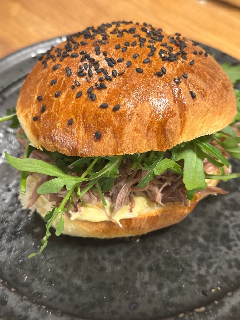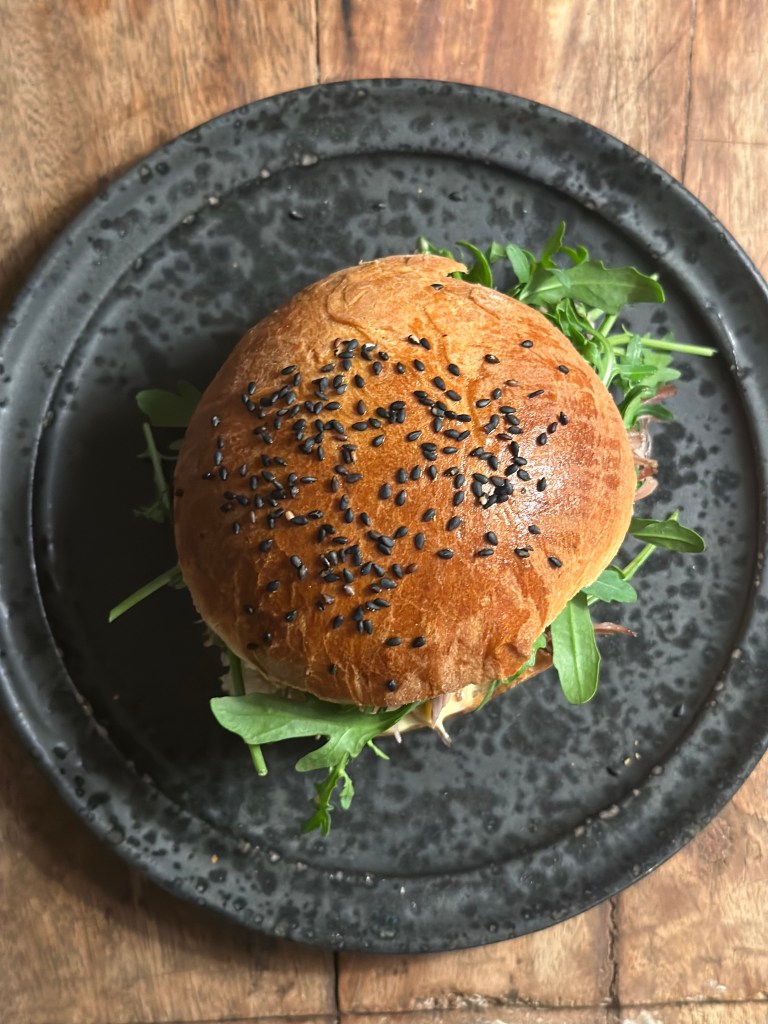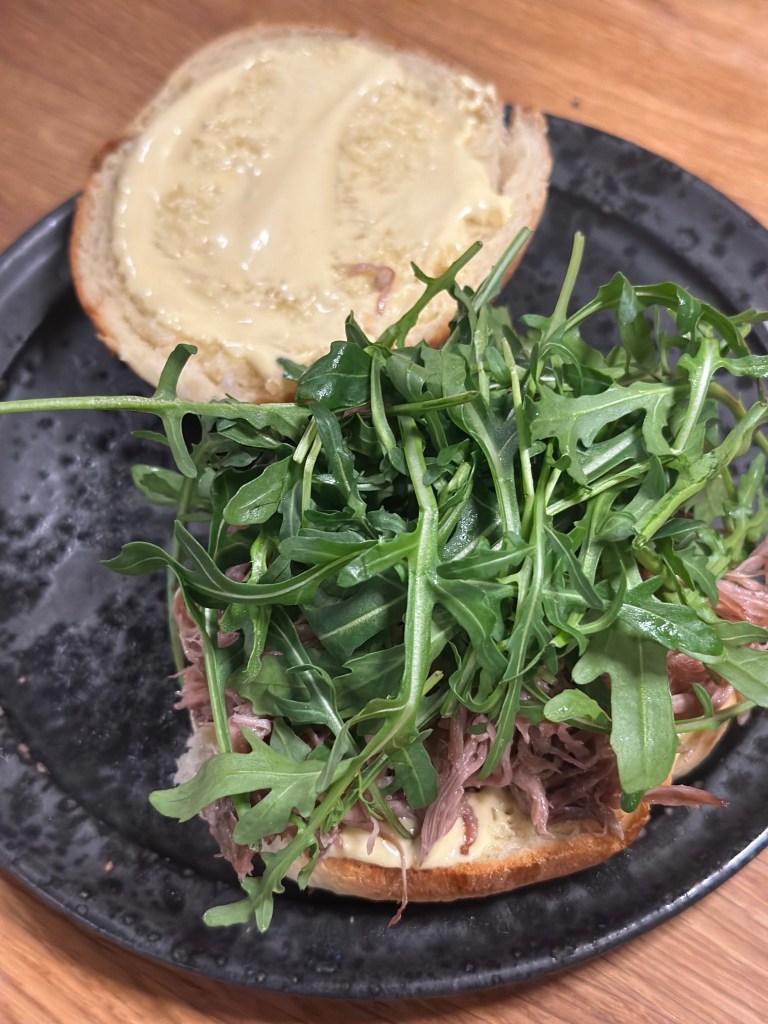 Dressingen er lige dele mayo og dijon sennep. Jeg bruger rucola salat, lidt rødløg om syltede agurker. Bollen er en brioche.