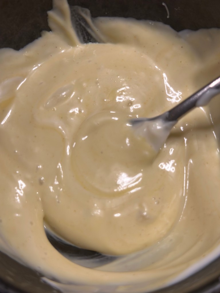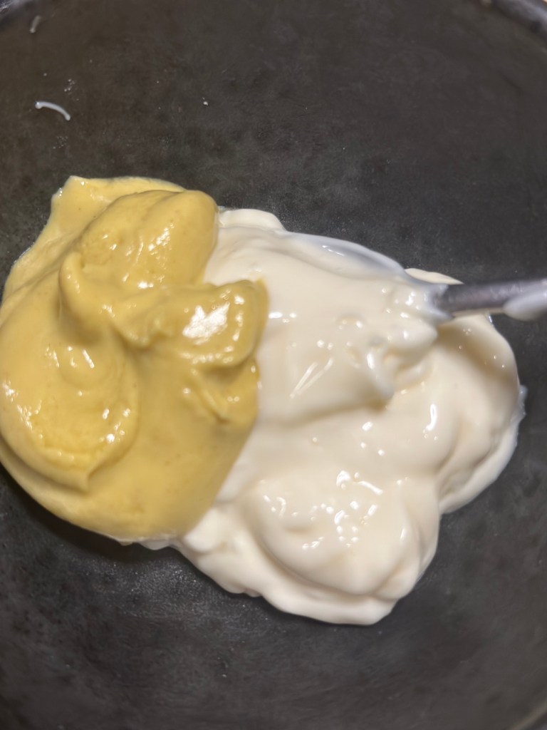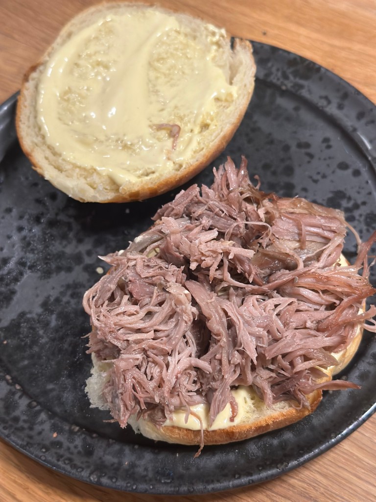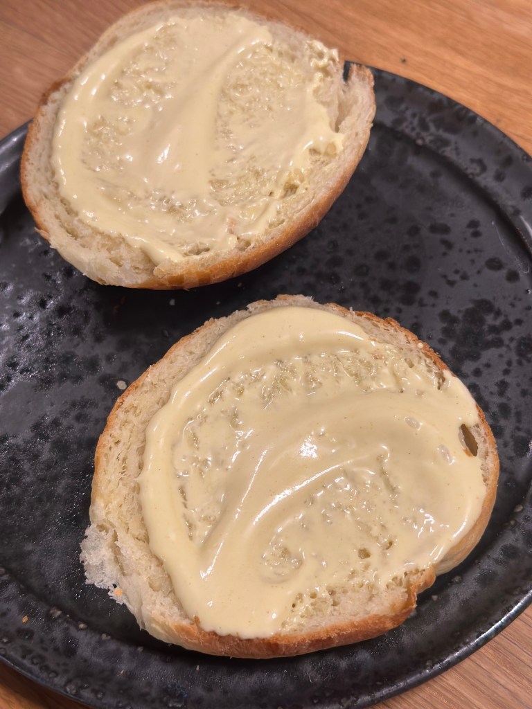 Dressingen er lige dele mayo og dijon sennep. Jeg bruger rucola salat, lidt rødløg om syltede agurker. Bollen er en brioche.