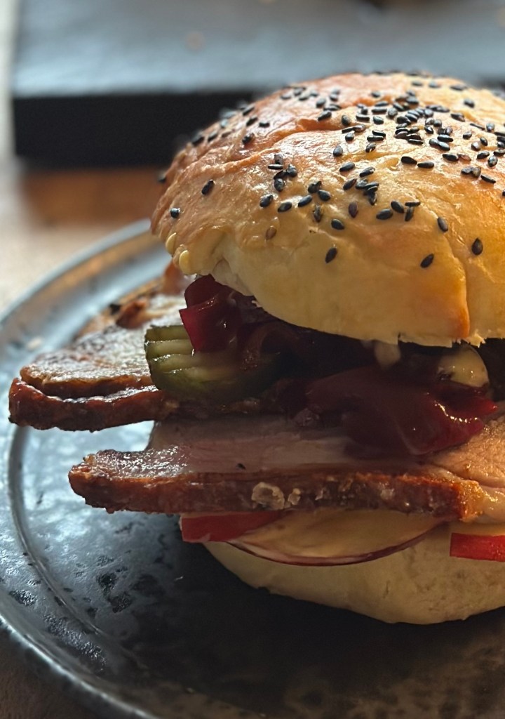 Flæskestegen har jeg to opskrifter på – en i ovn og en i airfryer. To skiver med 1 svær – altså ikke for tykke skiver. Jeg laver også min egen rødkål, hvilket gør den til et sundt alternativ til den udkogte på købe-glas – og så smager den bedre. Pickles eller drueagurker laver jeg også selv, men her er det også fint med købevariationerne. Meyers har lært mig at lægge et par tynde skiver æble i bunden. Endelig laver jeg en dressing med Dijon, min hjemmelavet mayo og min hjemmelavet allround krydderi. Prøv at lave det hele fra bunden og oplev en helt ny version af en gourmet flæskestegssandwich.
