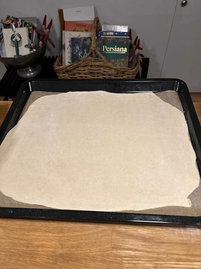 Lad den hæve en times tid, og rør igen i et par minutter. Lad den hvile i 20 minutter og den er klar til at blive rullet ud. Disse trin er vigtige, fordi den ellers trækker sig sammen, når man ruller den ud.