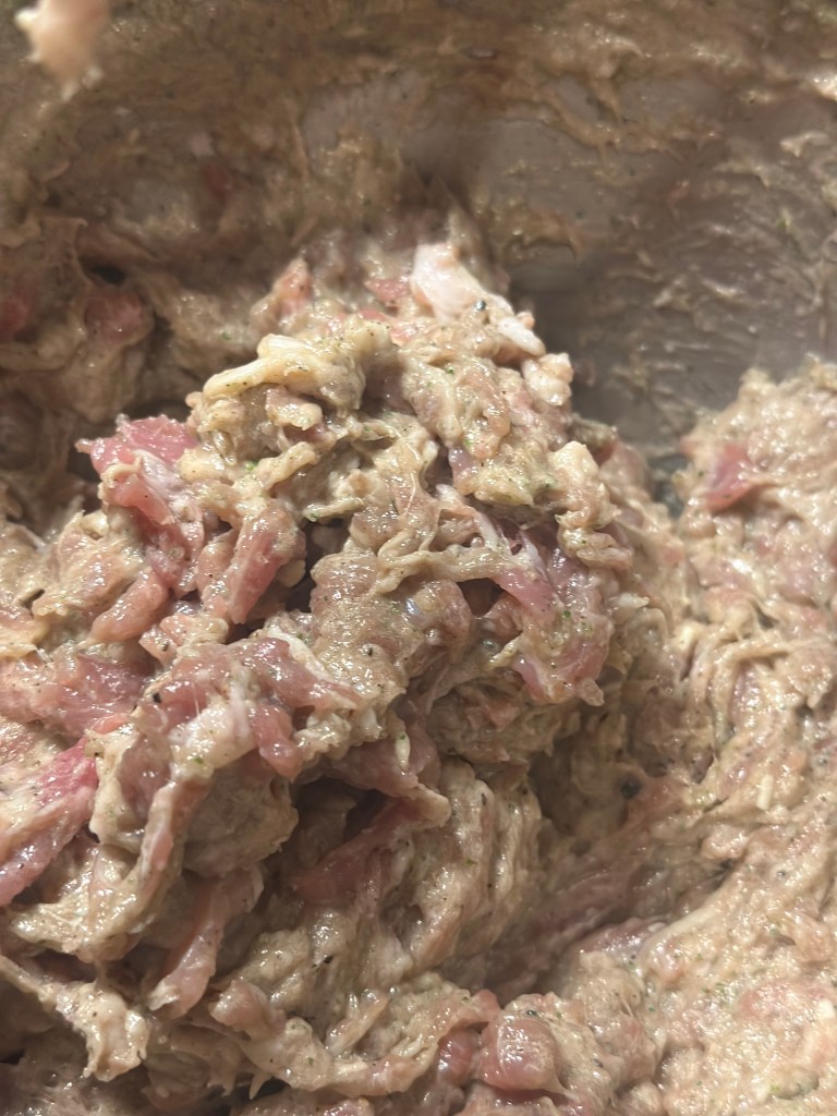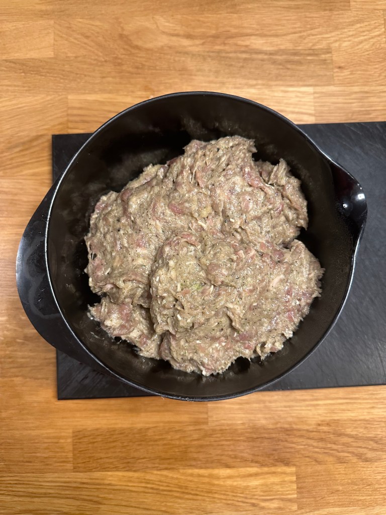 Fasen er den nemme del. Jeg bruger nakkekoteletter, men du kan sagtens købe hakket svinekød. Der skal helst et fedtniveau på 20% til en god smag. Jeg kører det igennem kødhakkeren på den groveste indstilling.