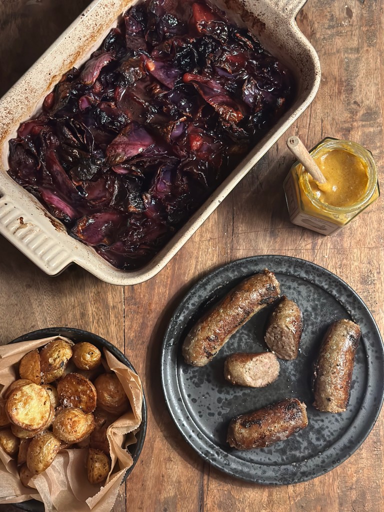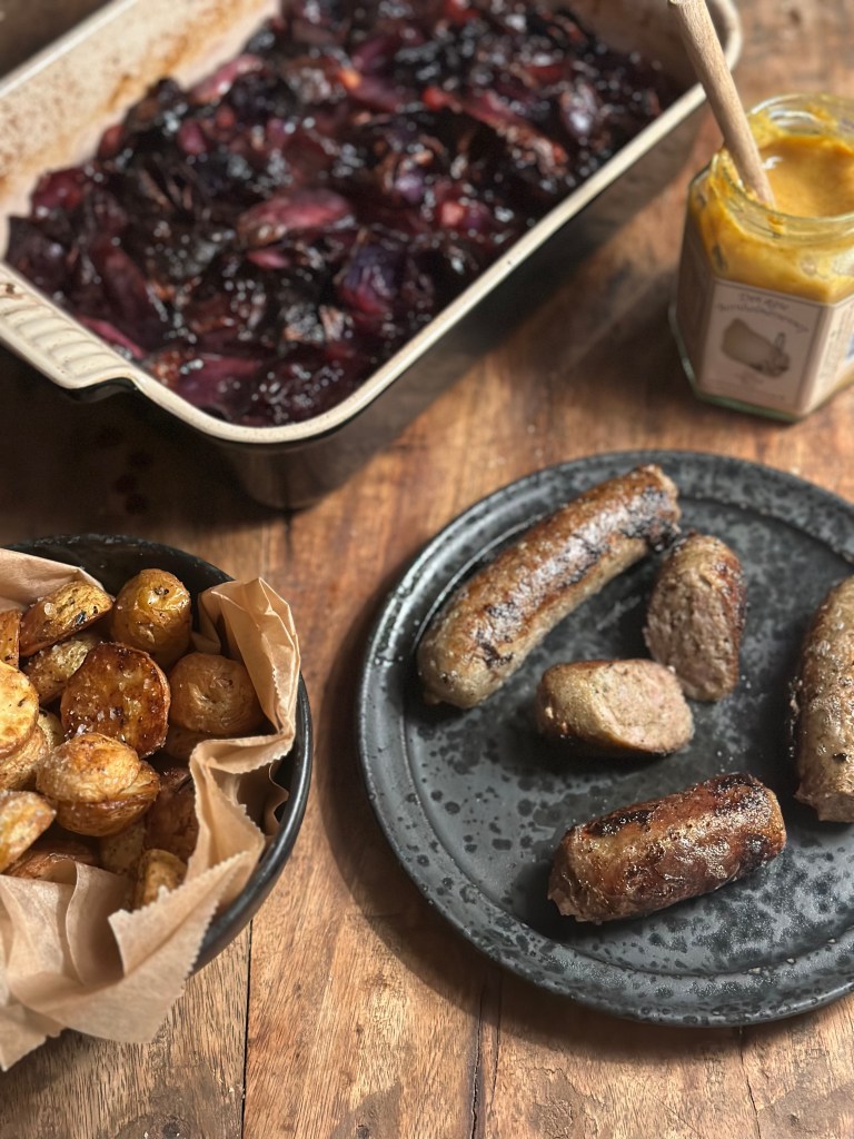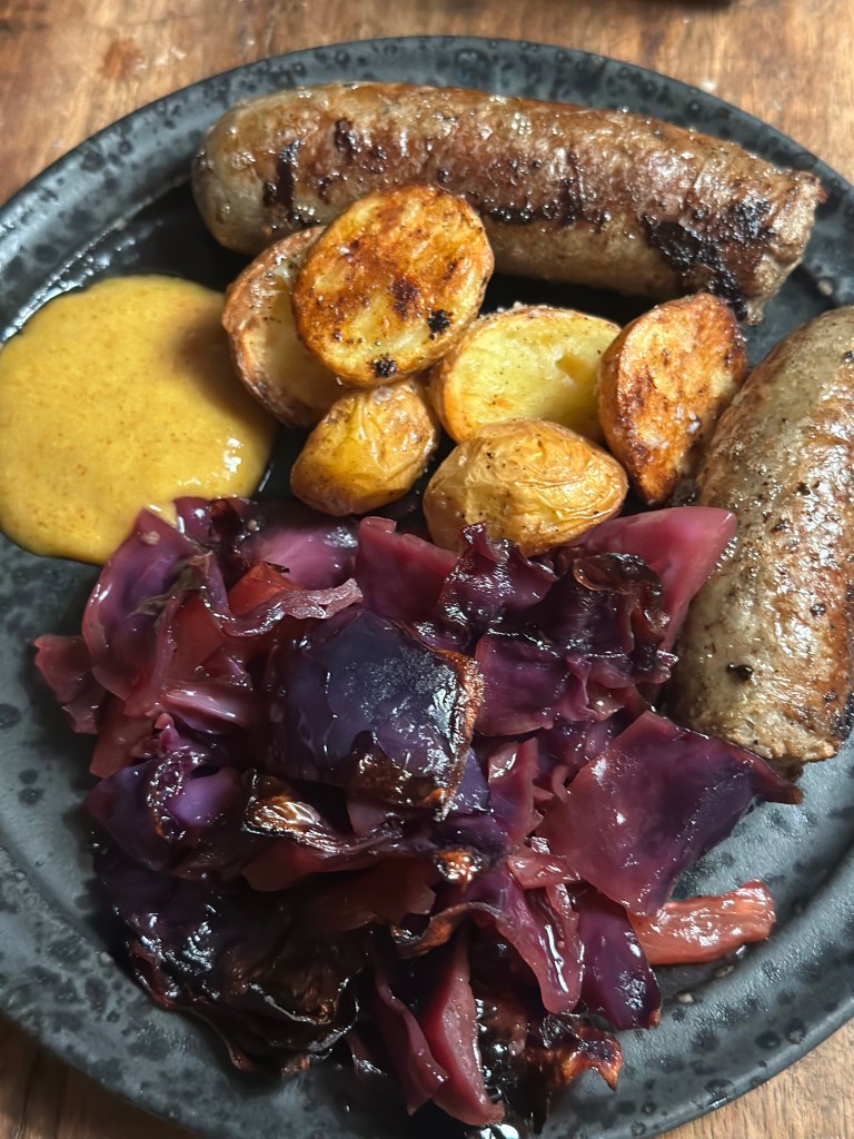 Jeg serverer den med Bagt rødkål, stegte kartofler og Bornholmsk sennep.