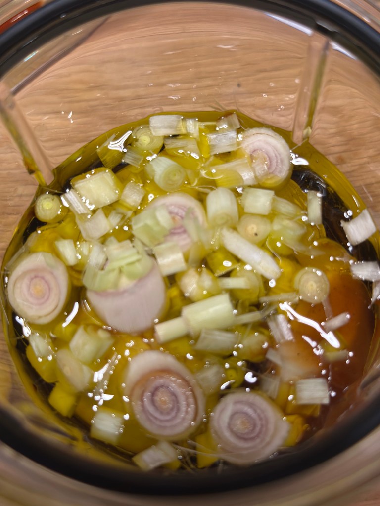 Jeg blender først alle ingredienserne (udover kødet). Tag dog det yderste blad af citrongræsset, og skær det i mindre stykker først.
