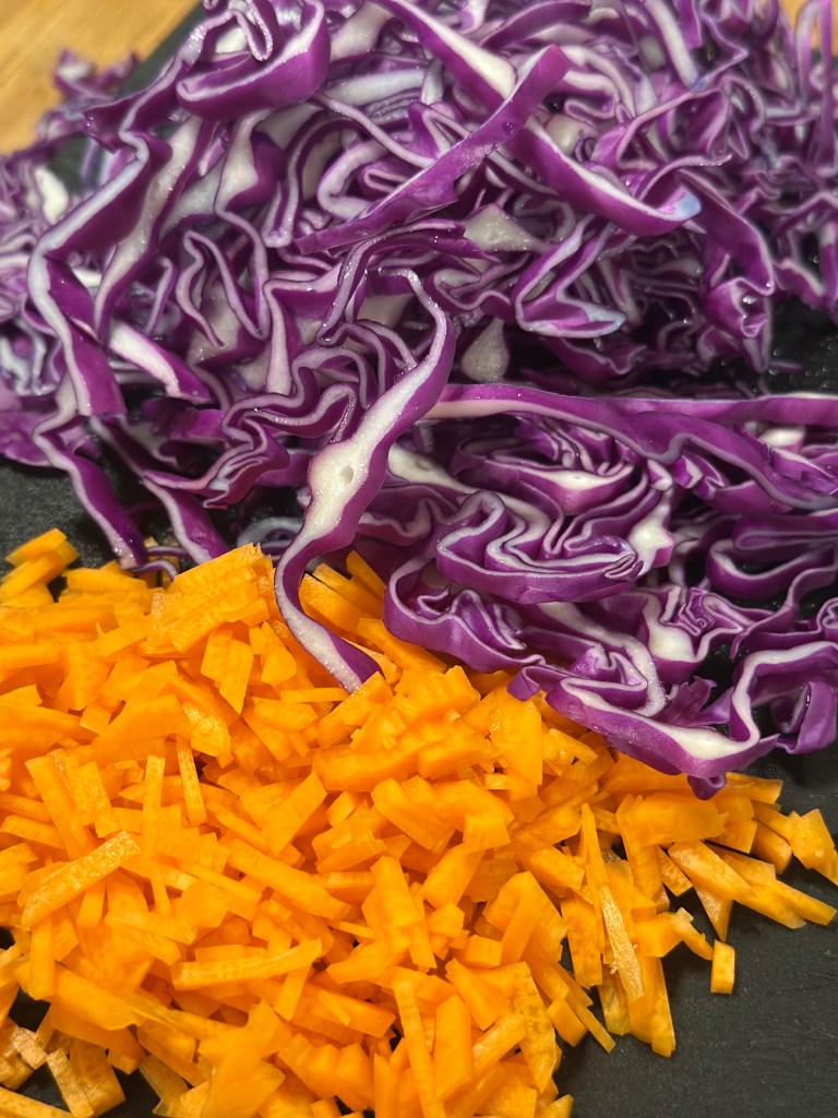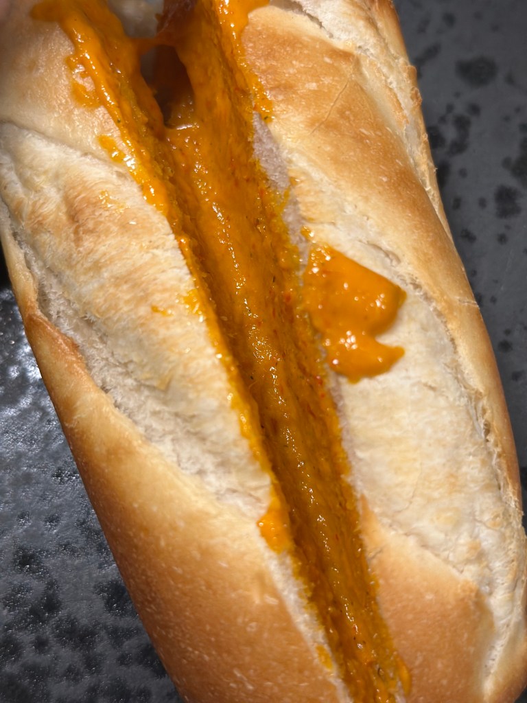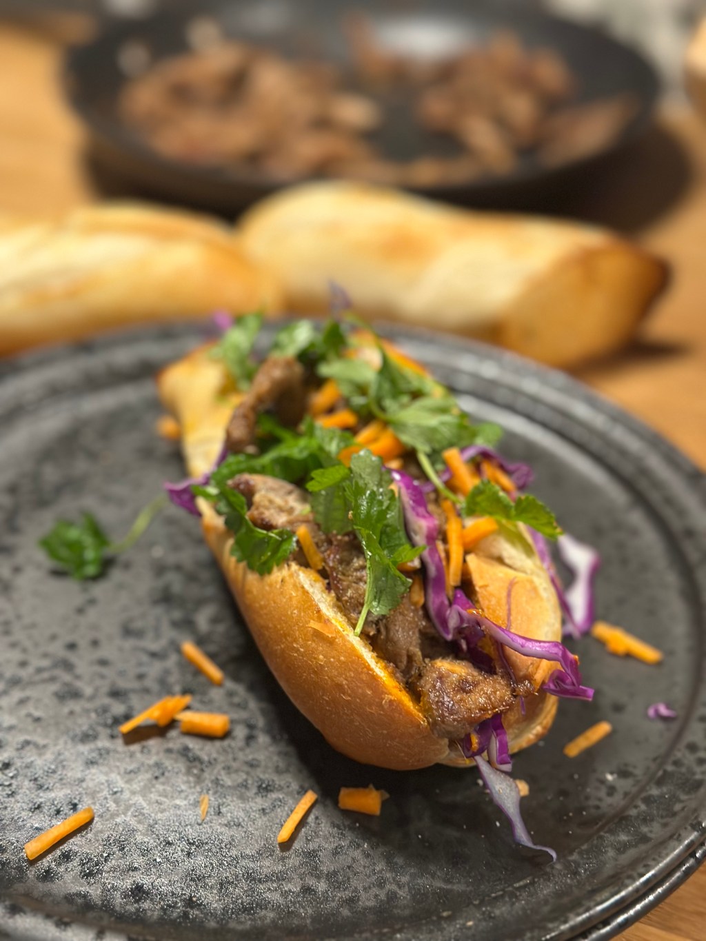 Baguetten kommer du i ovnen, hvor du har skåret et snit igennem. Smør med Chili dressingen – alt efter smag og behag. Jeg bruger Gulerødder og rødspidskål, men du kan vælge alt slags salat. Kød efter smag og top med friske koriander.