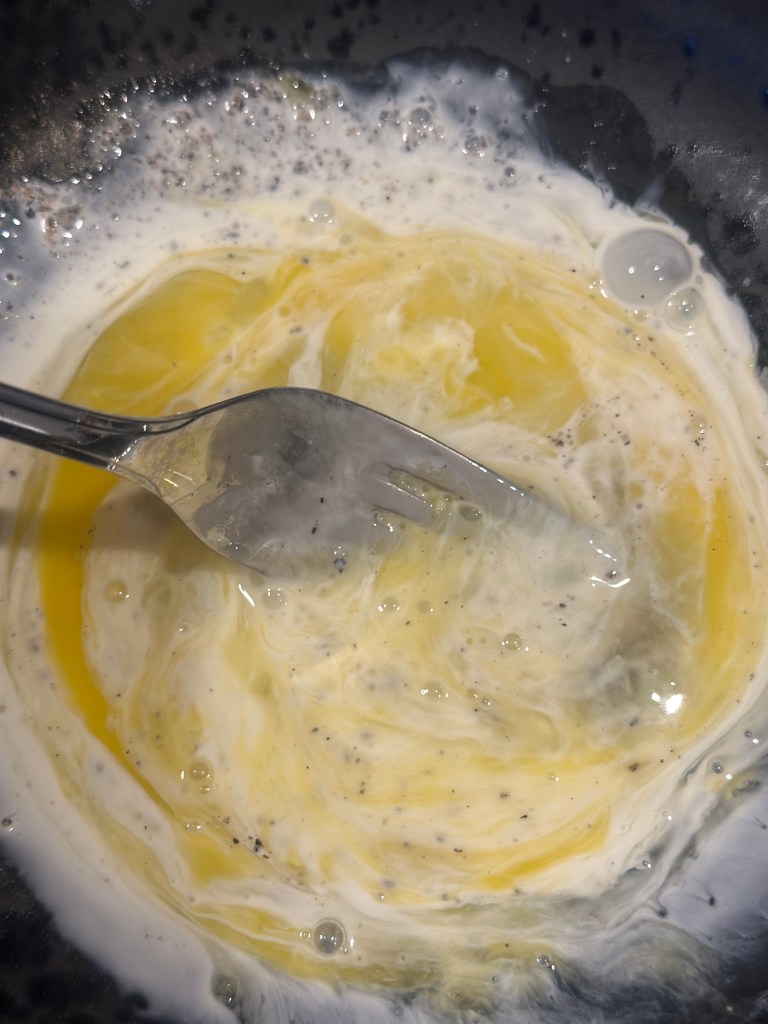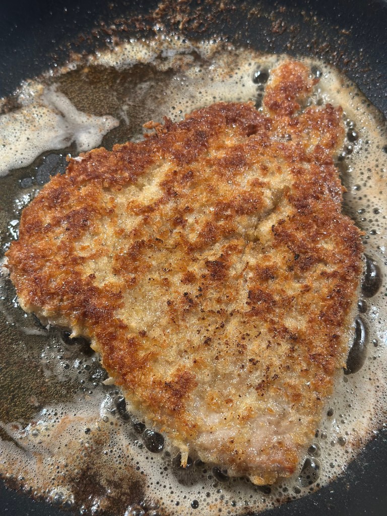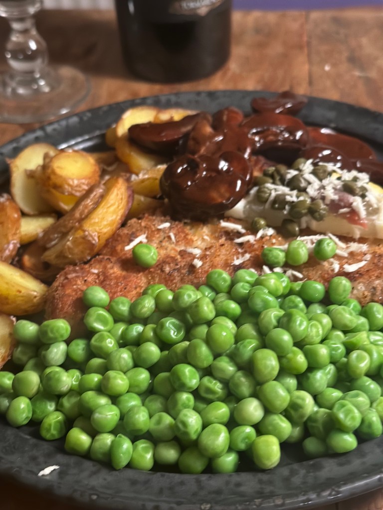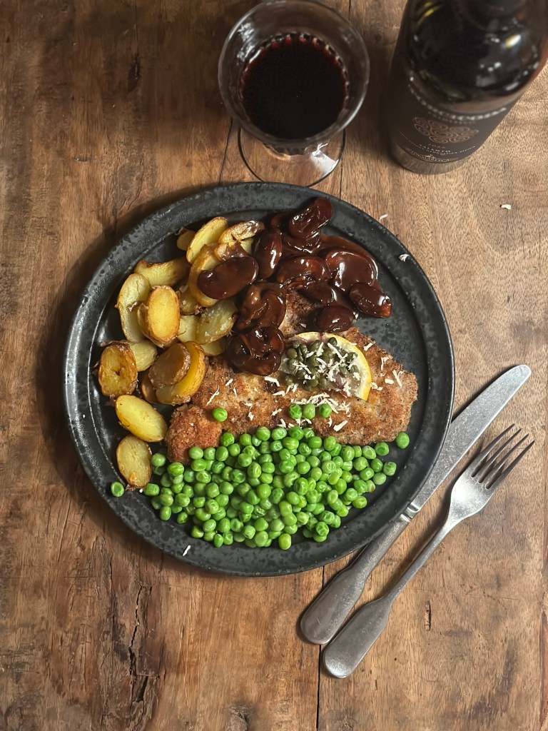 En schnitzel serveres typisk med ærter, stegte kartofler og en pandesauce. En pande sauce er i min optik enten smørret tilbage eller en brun sauce. Og så skal der på den danske version “en dreng” på toppen.