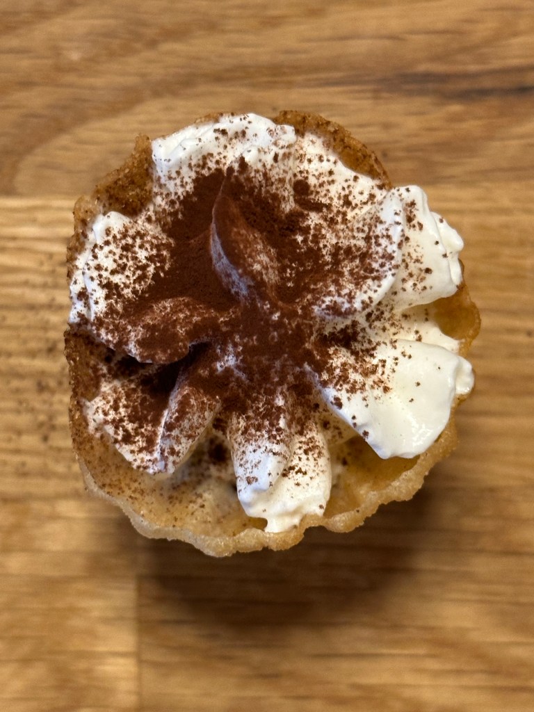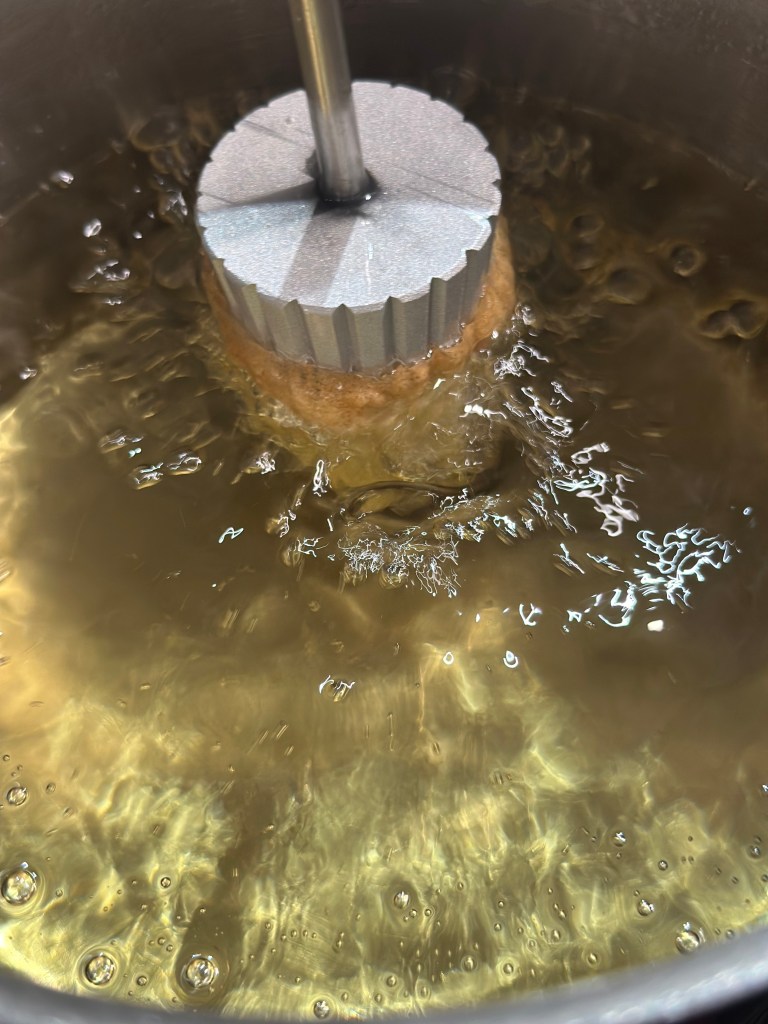 Herefter er princippet, dyp krustadejernet i dejen, men hold 1 cm fris fra toppen. Dyp ned i gryden og helt under med det samme, da toppen eller “buler ud”. Når den er lysbrun, tager du den op og skår forsigtigt på jernets bue for at få krustaden til at slippe. Lad den tørre på et rent viskestykke.