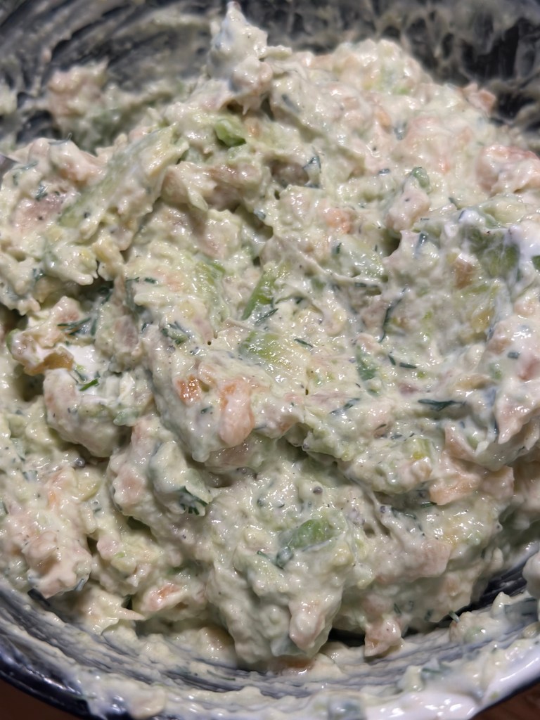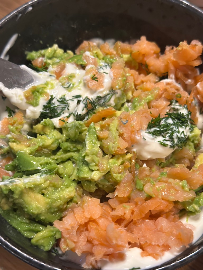 Finthakket laksen, moser avocadoen med en gaffel og blander med de øvrige ingredienser. Lader den trække lidt på køl før jeg bruger den.