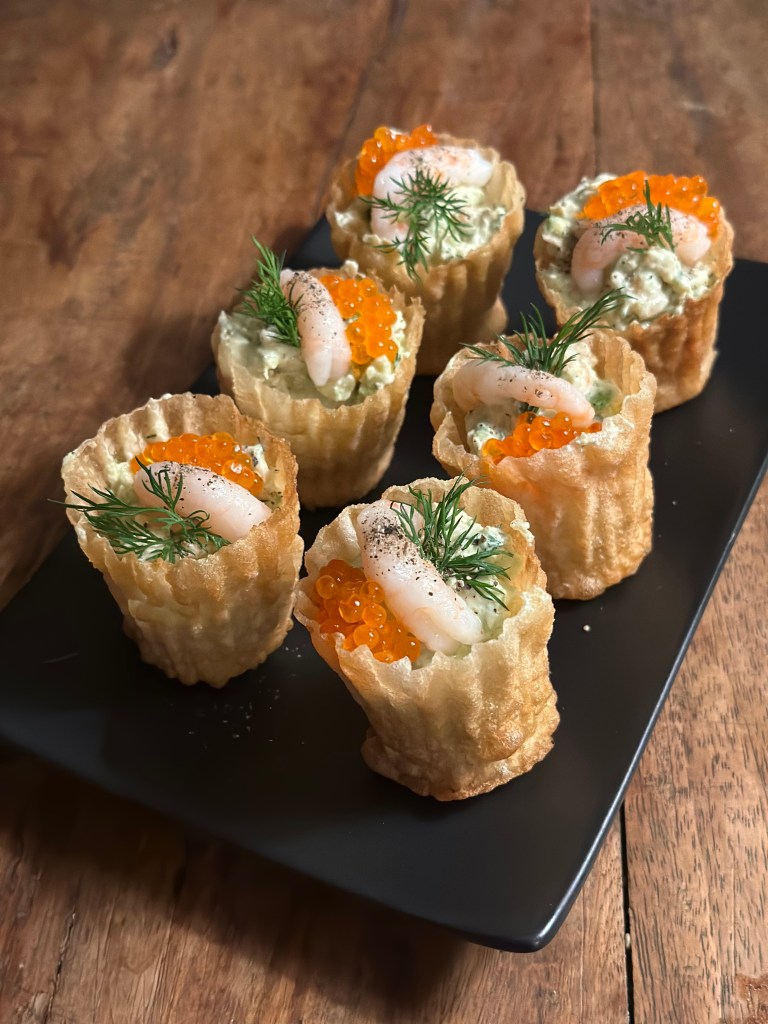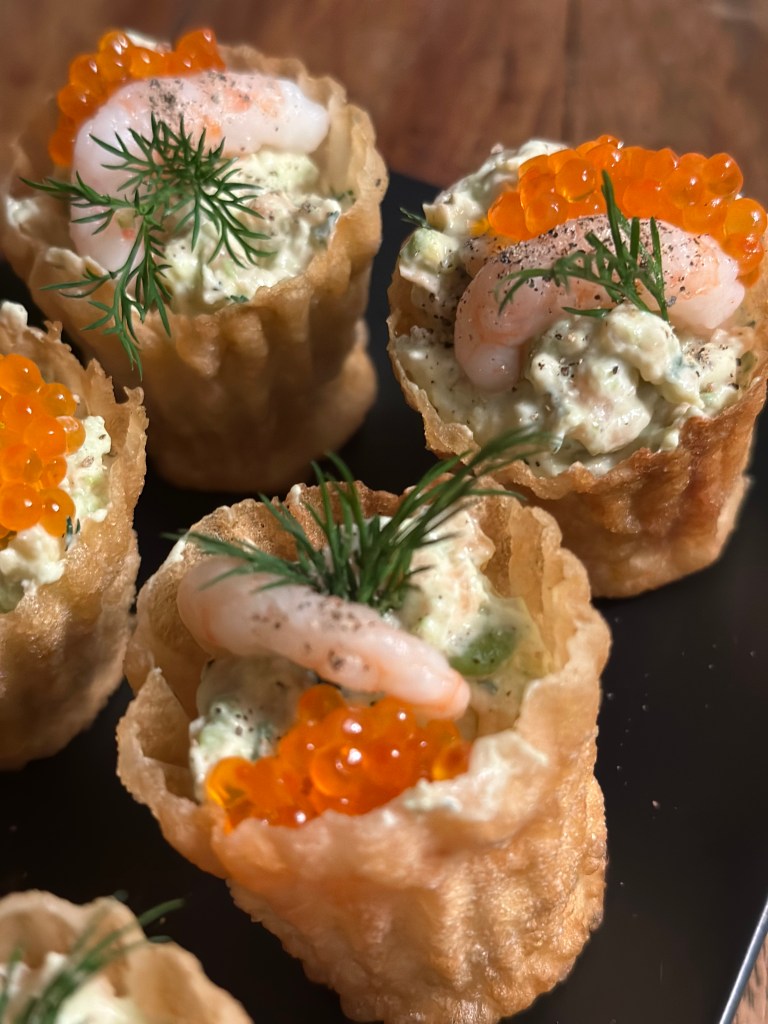 Pynter med en reje, ørredrogn og dild.
