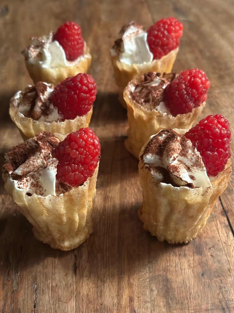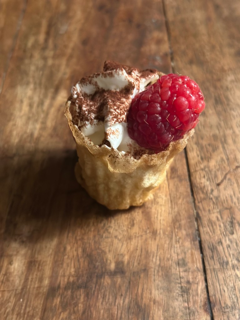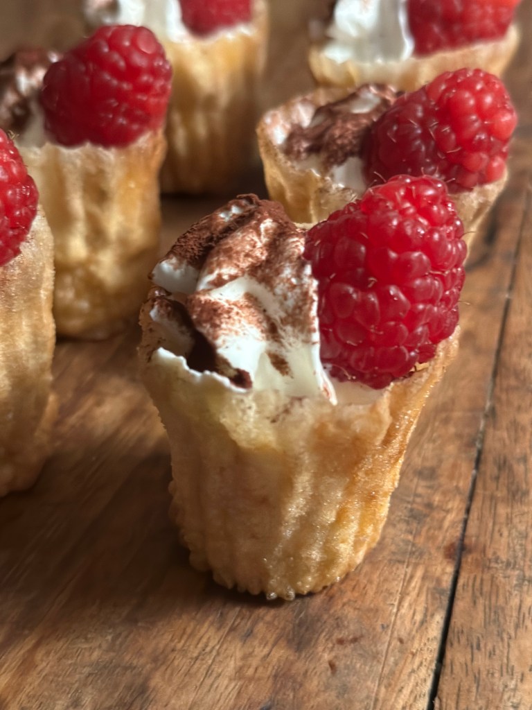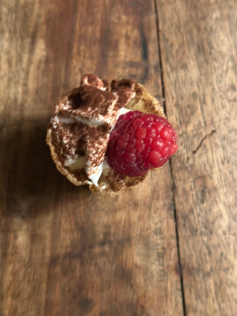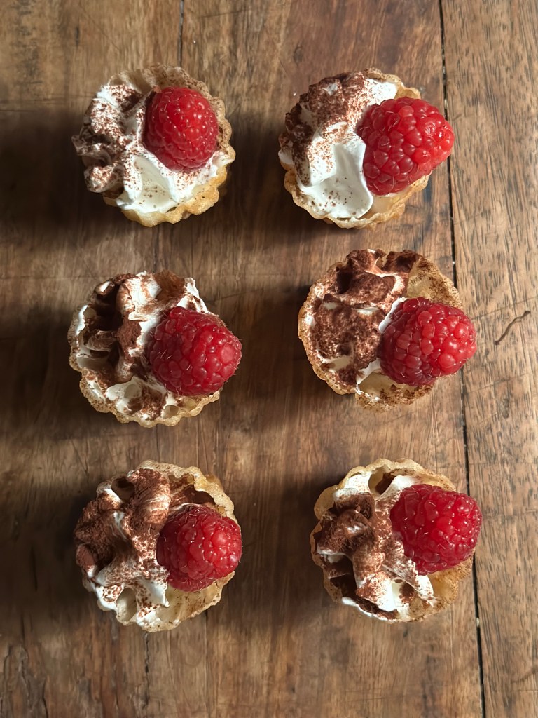 En simpel klassiker, er en bund af kagecreme, et hindbær, flødeskum som drysses med kakao, og et frisk hindbær på toppen. Du kan også bruge andre bær eller frugter.