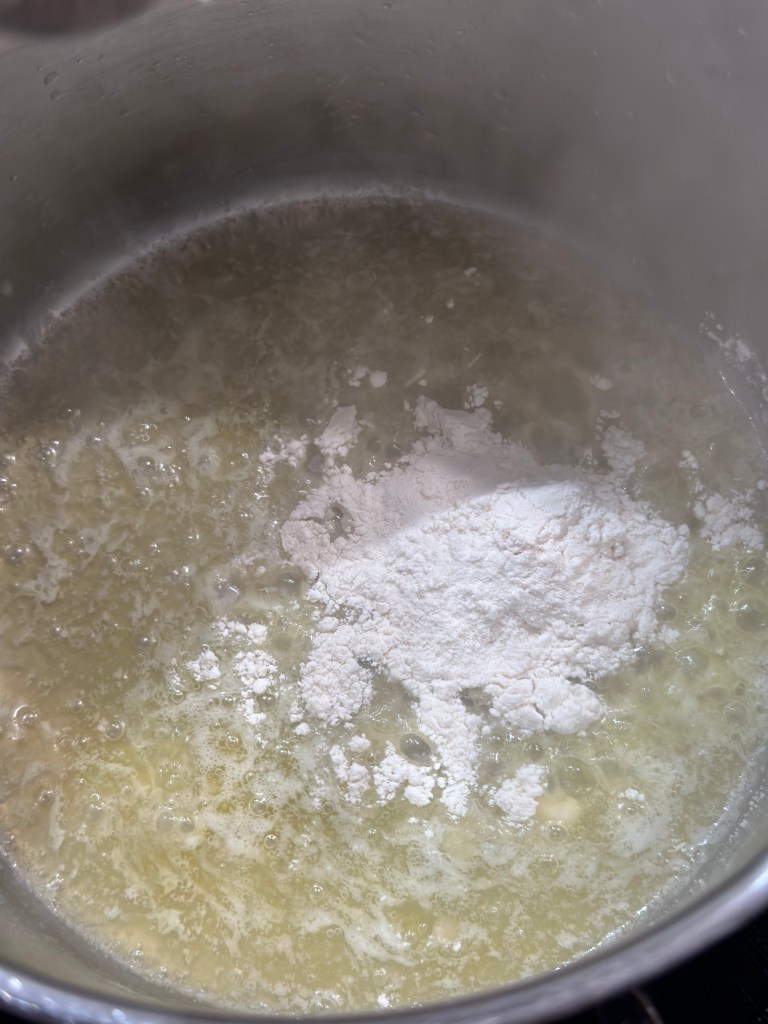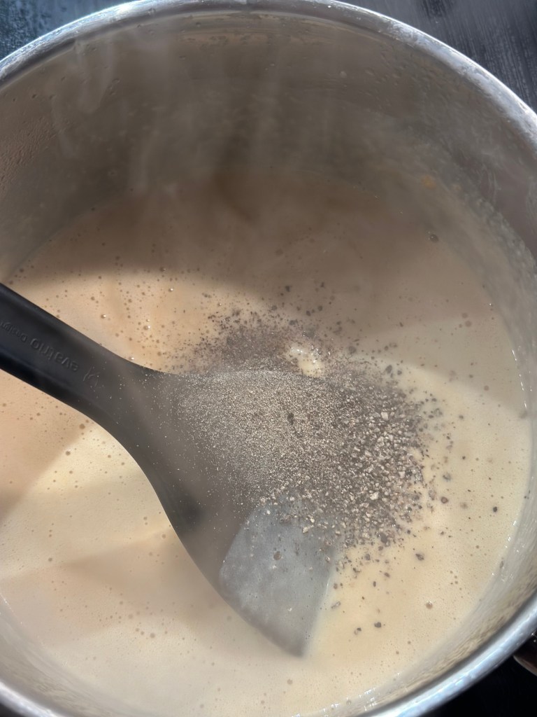 Smelt smør og tilsæt melet. Bland det godt til en slags “creme”, og tilsæt herefter fond – lad det koge op til det har en tyk sauce konsistens. Tilsæt herefter fløde, således den ender med at være en sauce til den tynde side. Kom osten i, og lad den smelte sammen med saucen, og tilsæt herefter peber og chili – smag til med soyasauce og worcestershire sauce for at få syre og salt til. Hvis du er til en stærk version, så kom en ekstra tsk chili eller cayenne i.