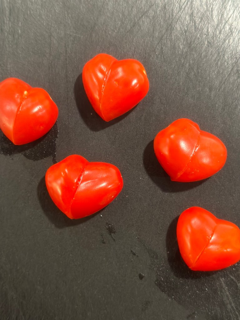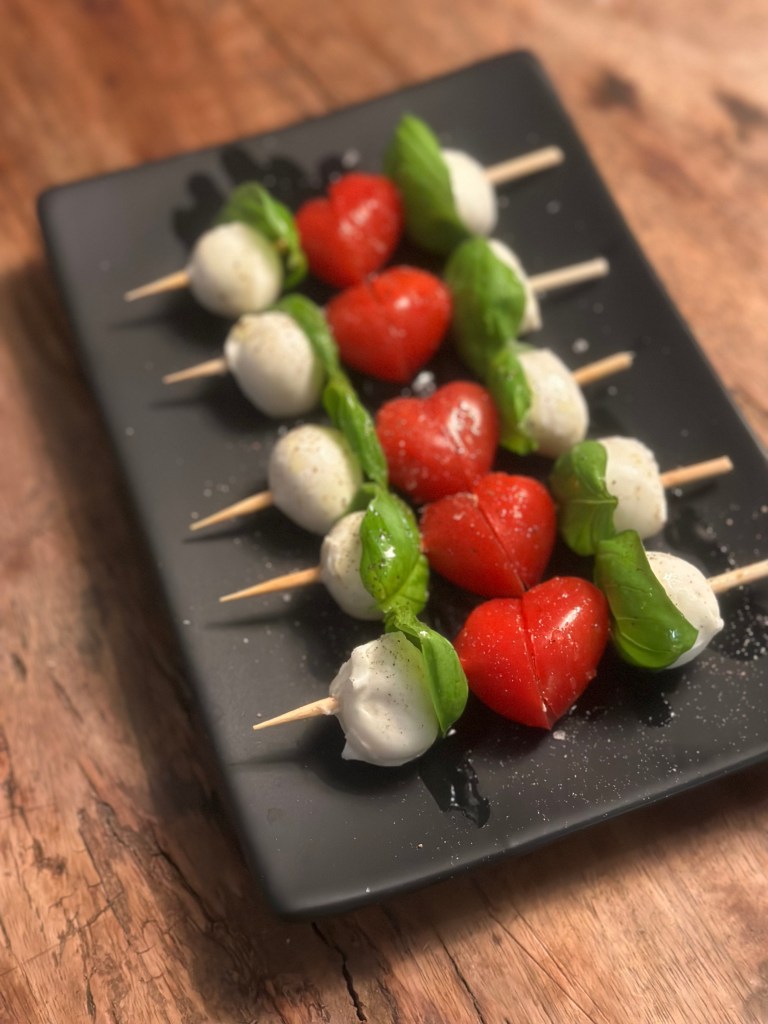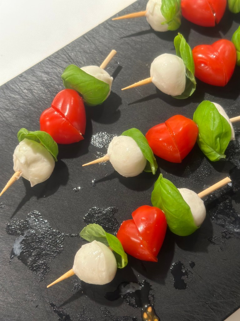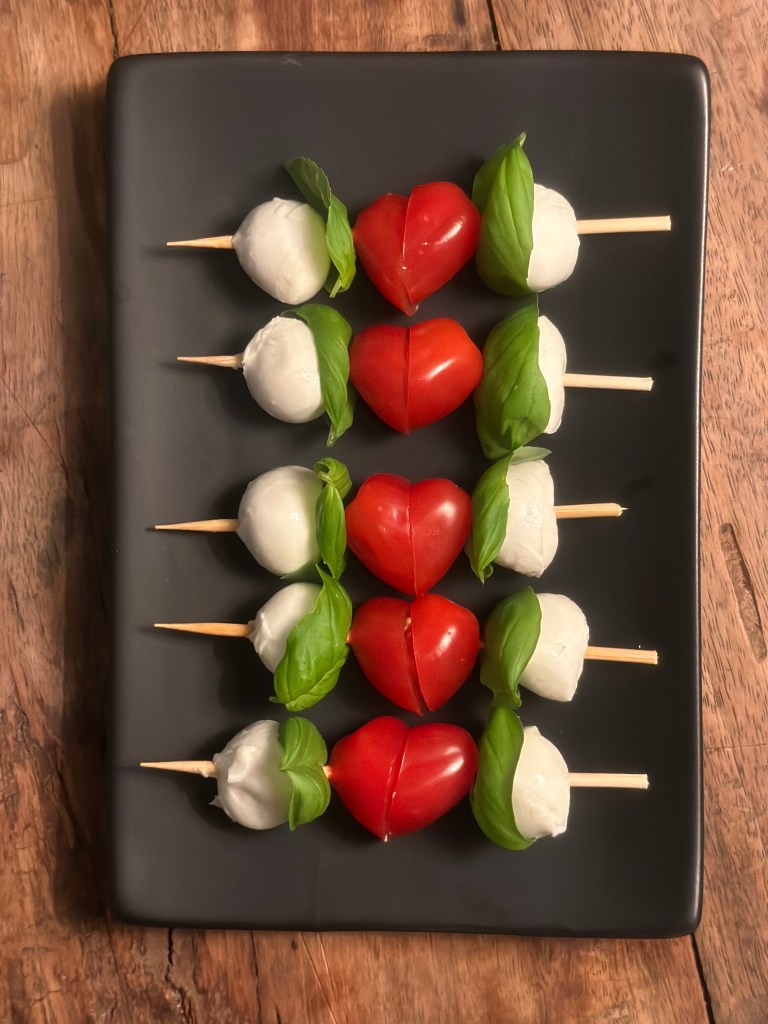I anledning at Valentines day den 14. Februar, så har jeg lavet denne version, hvor jeg tager en aflang cherry tomat og skærer den skråt. Vender den ene en halv omgang, og så kommer der et hjerte. Super nemt. Monterer til på en bambuspind med friske basilikumblade, og små runde mozzarella kugler. Dresser med en god olivenolie, flagesalt og friskkværnet peber. Og så kan du servere for din kæreste.. Og du behøver ikke vente til Valentines day – kærligheden skal dyrkes alle dage.