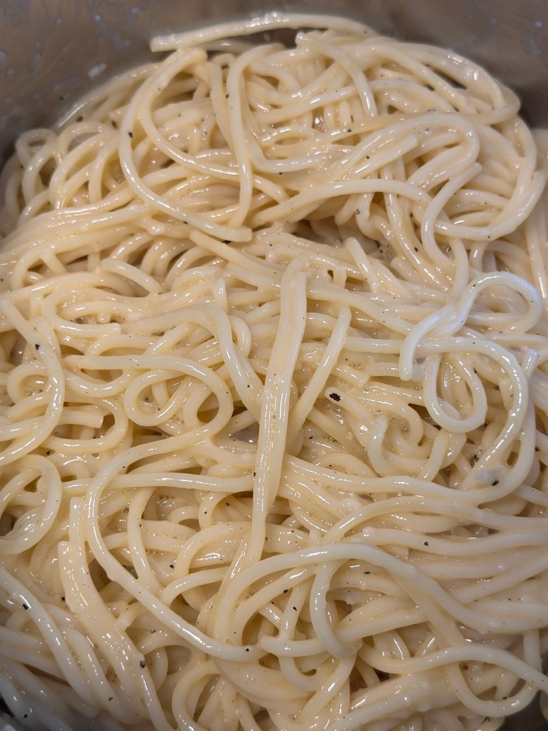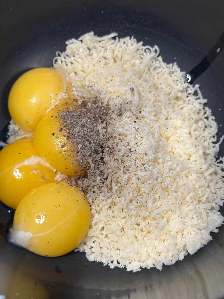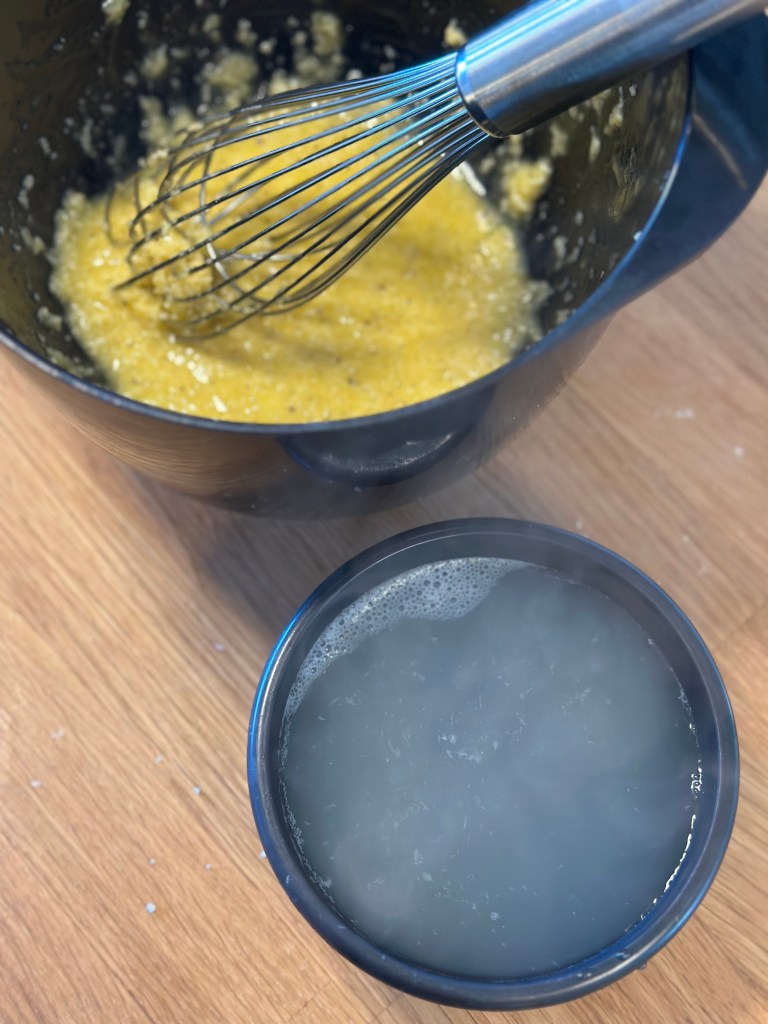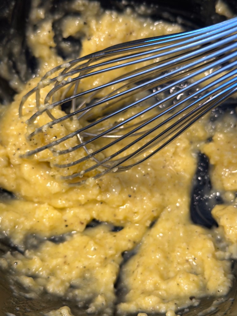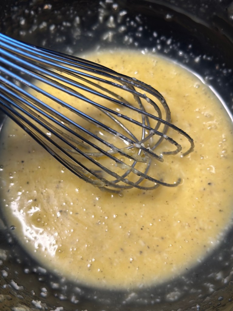 - Lad den væske fra, køle lidt inden du tilsætter ca. 1 dl i æg/parmesan massen. Pisk det godt sammen til en creme.
