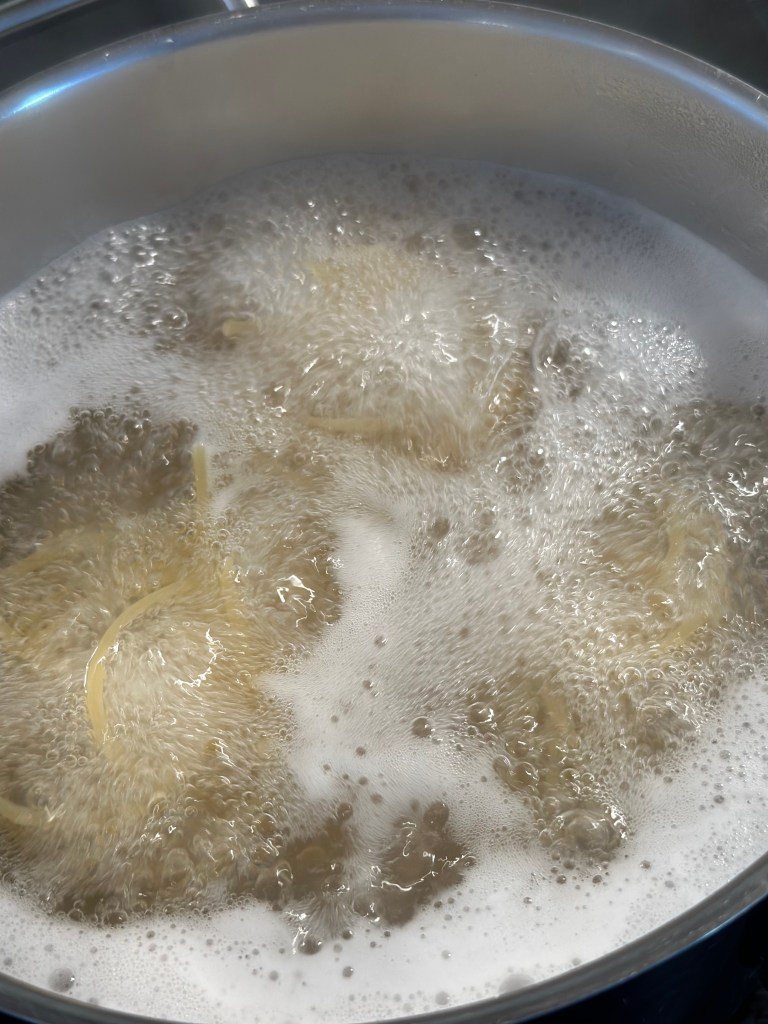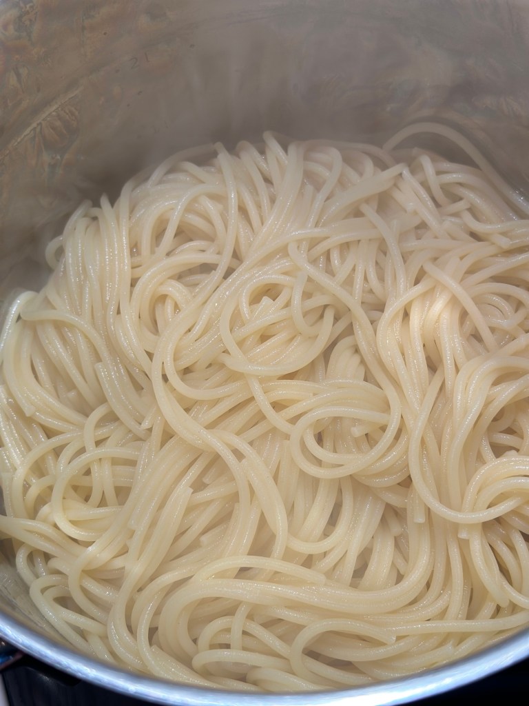 - Sæt vand over til spagettien – tilsæt rigeligt med salt