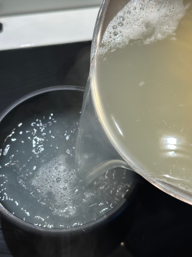 - Når spagettien er al dente, hælder du et par deciliter væske fra, inden du hælder resten af vandet fra.
