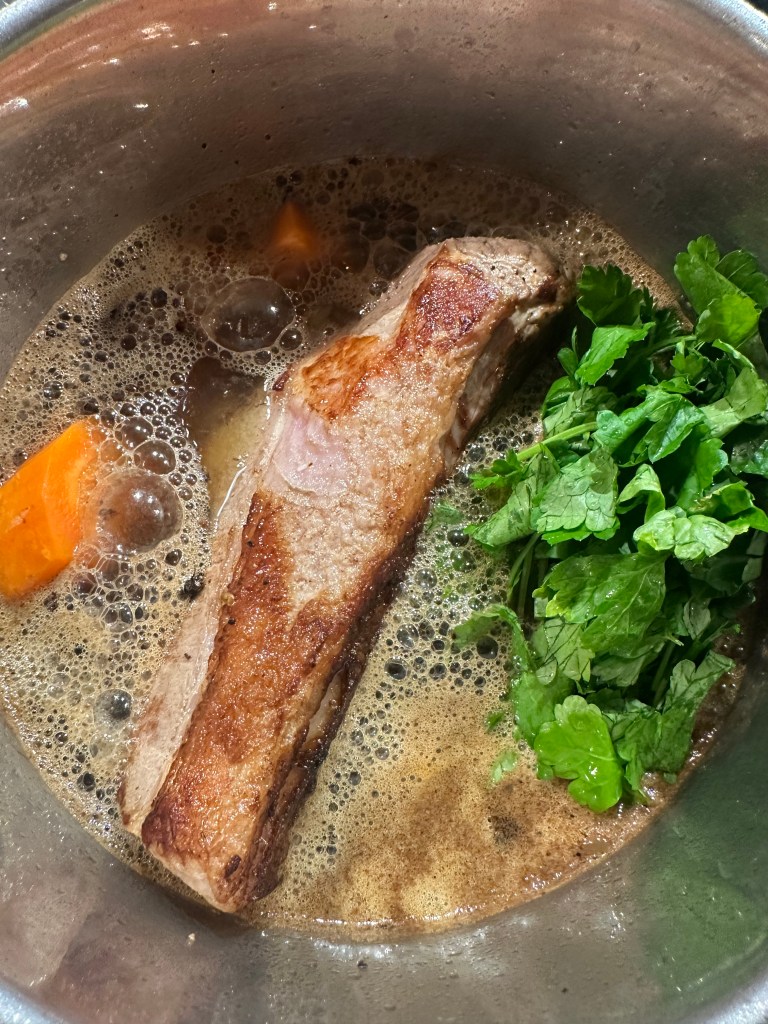 Svits løgene i smør og brun stegen på alle sider. Tilsæt San Pellegrino og de øvrige ingredienser. Lad det hele simre i mindst 2 timer ved lav varme.