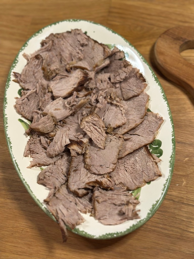 Når kødet er færdigt lægges det på køl, og skæres i tynde skiver når det er helt koldt.