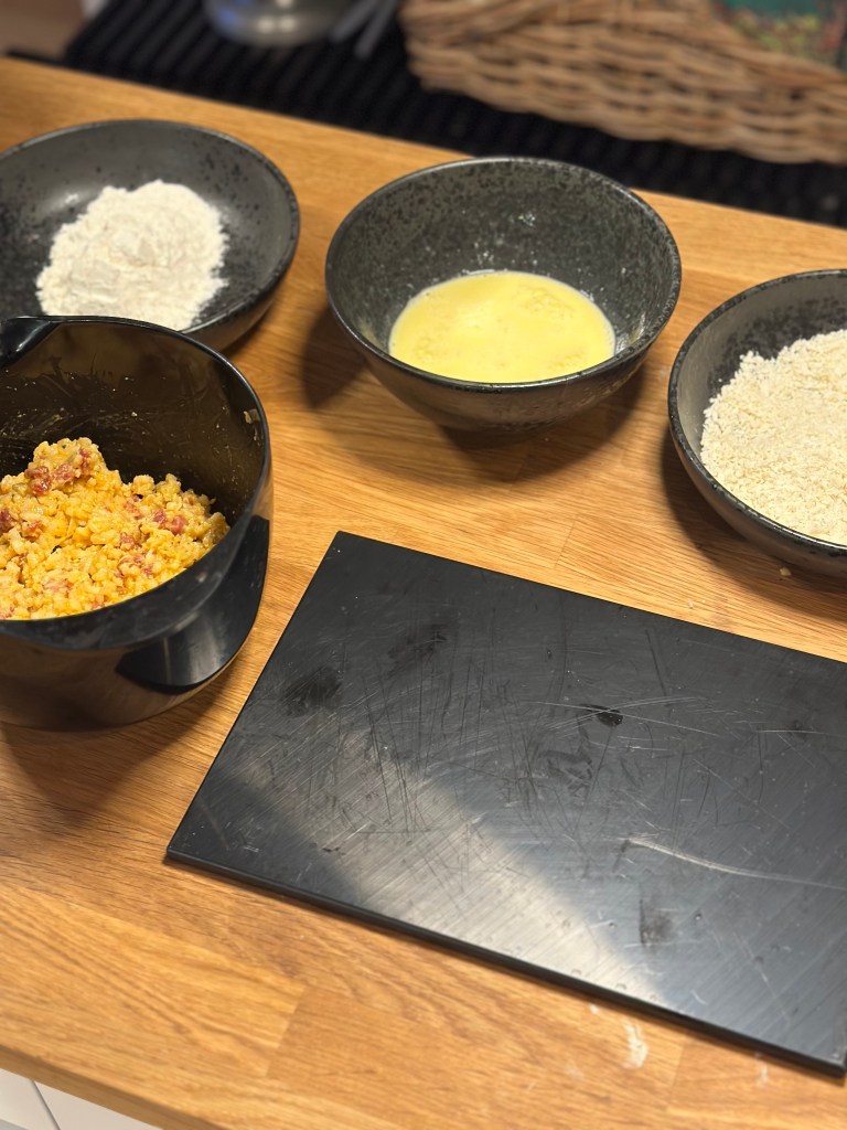 Lav 3 skåle. En med hvedemel. En med pisket æg med lidt fløde. Og en med panko raps. Sæt en liter olie over i en gryde og varm op til 170 grader – prøv at holde den der. Mens den bliver klar, former du kugler af farsen – en spiseske fra skuffen fungerer som hjælp. Vend dem i melet. Lav alle med melet først.