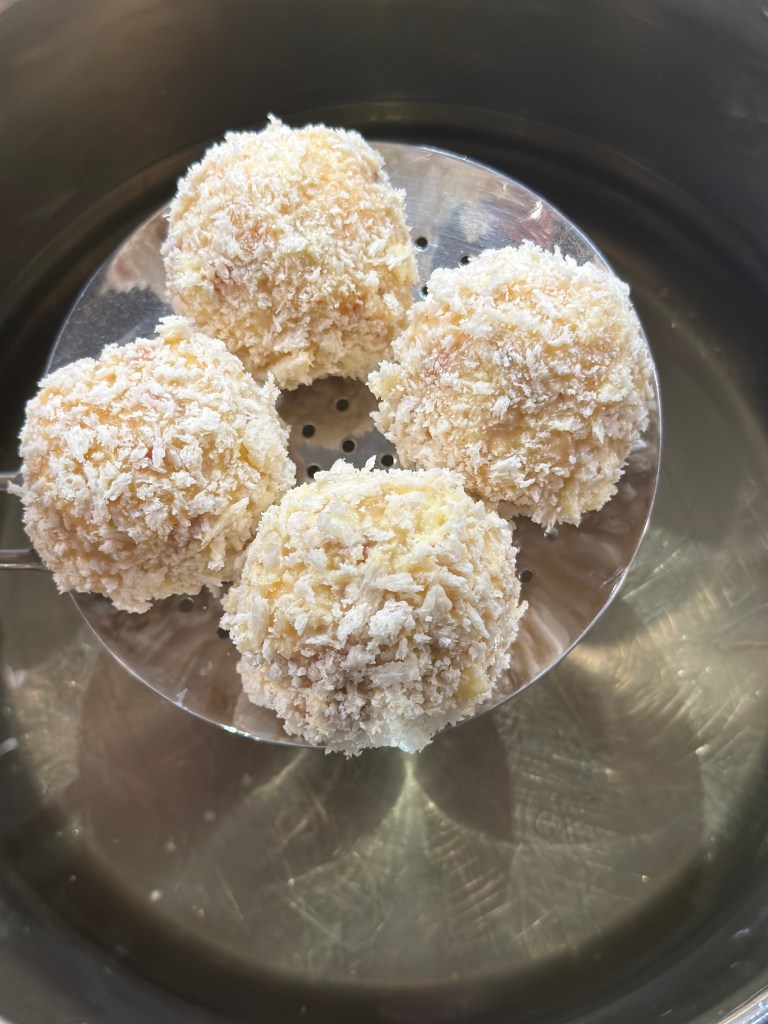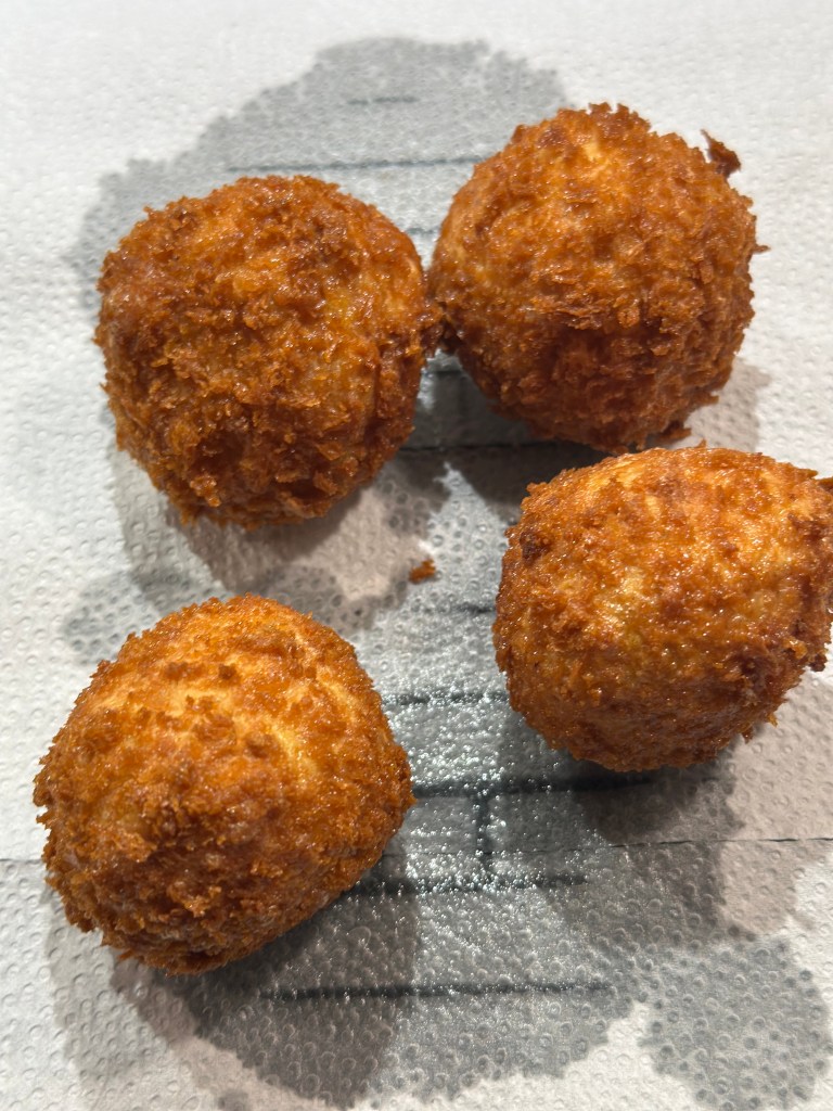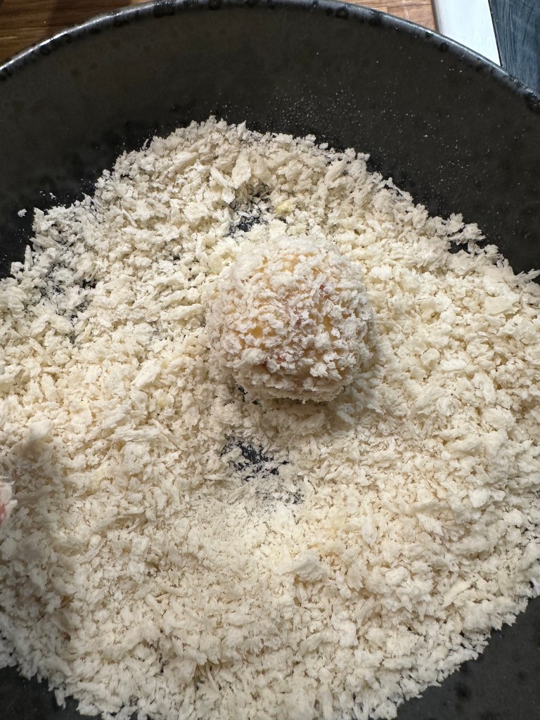 Herefter vender du kuglerne i æg og herefter panko. For hver 4-5 du har, kommer du dem i gryden. Den skal være helt mørkgyldne.
