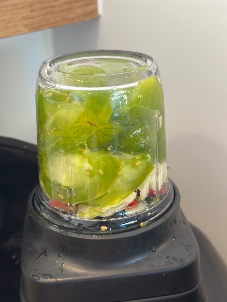 Alle ingredienserne skal i en blender, men kun lige blendes let. Kan holde sig en uges tid.