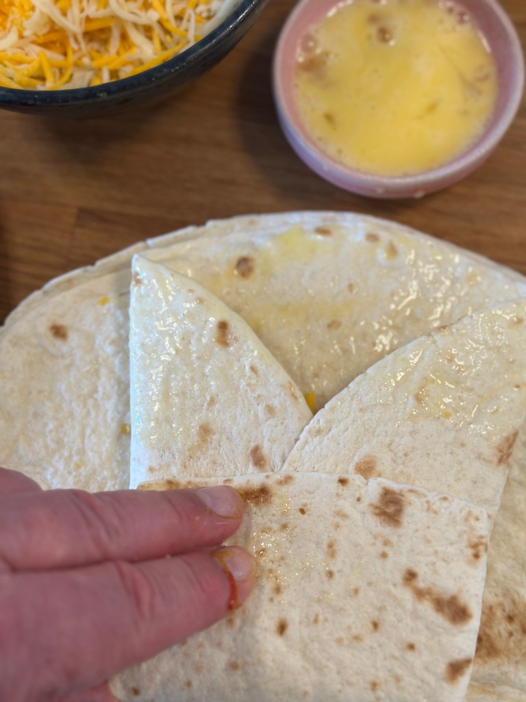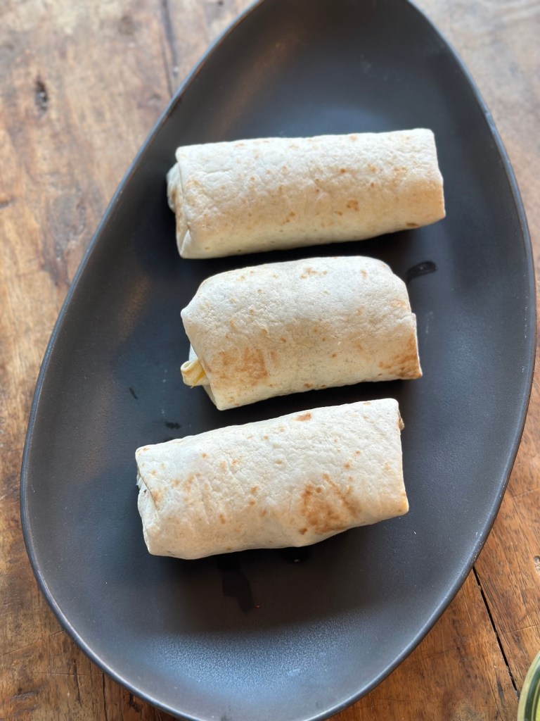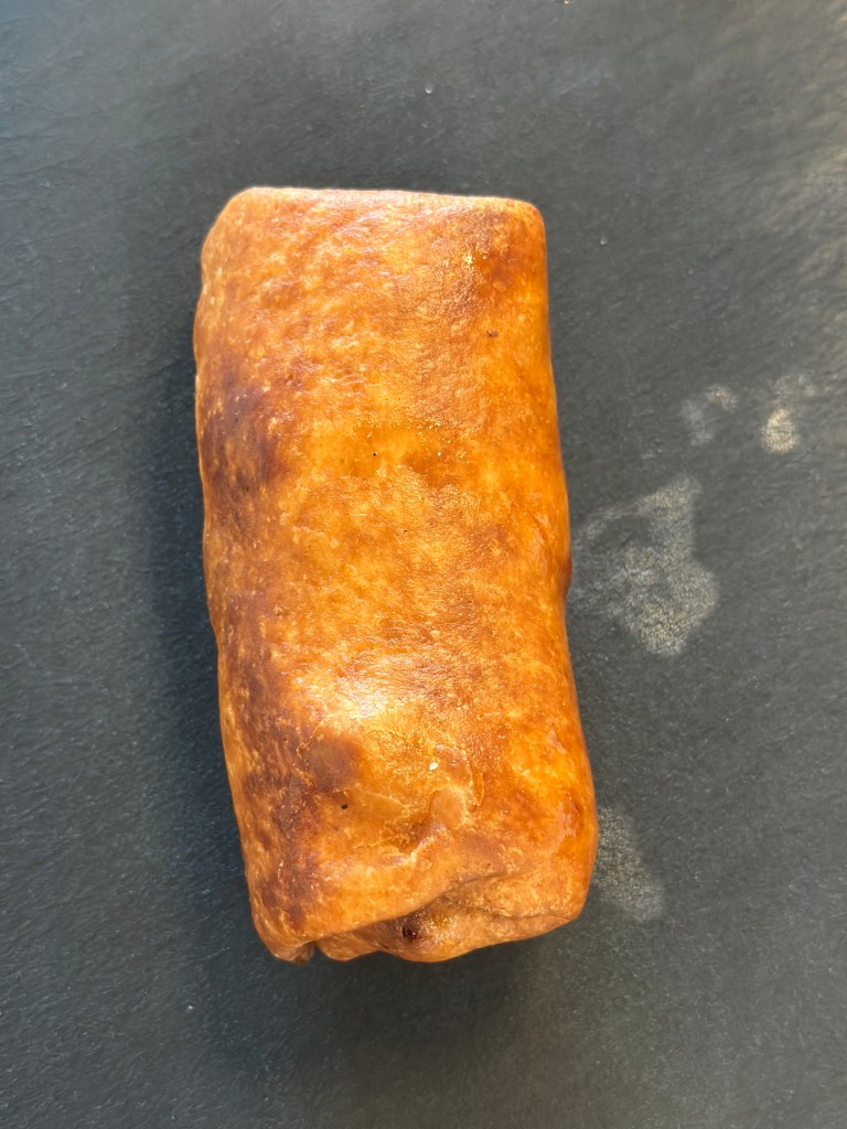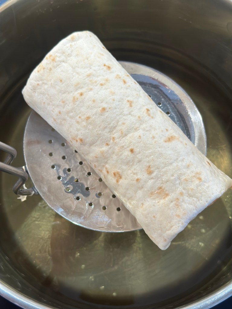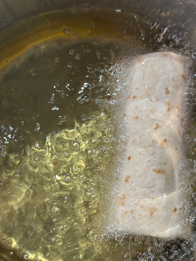 Fold Burrito som vist på billedet, og brug et shaket æg som “klister”. Kom ned i frituren – 170 grader varmt solsikkeolie til den er gylden på alle sider.