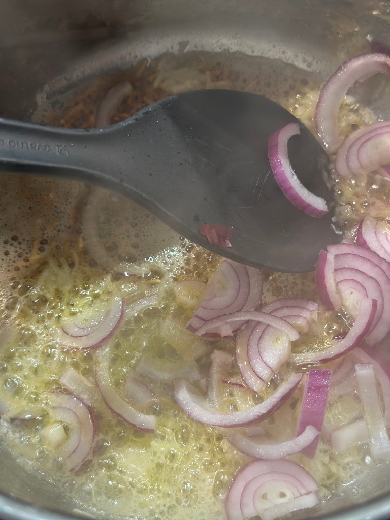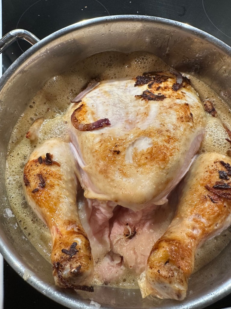 Brun kylling og løg i smør. Tilsæt krydderiblandingen, danskvand og æblemost. Lad kyllingen simre under låg i lidt over en time, eller så du kan se kødet løsner sig af sig selv.