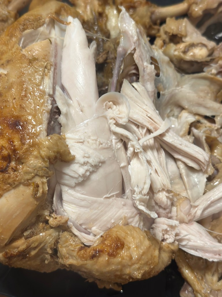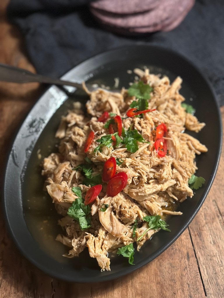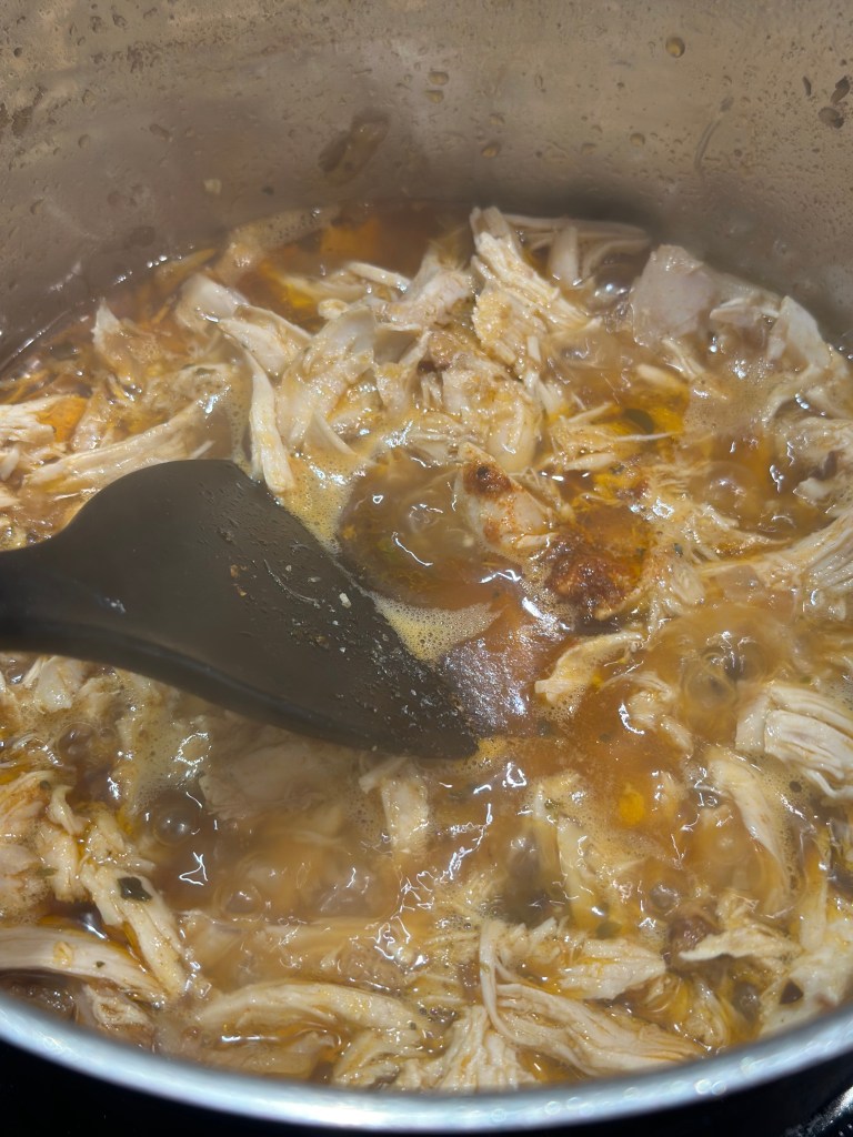 Når kyllingen er færdig, tager du den op af væden, som nu er blevet til din mexicanske hønsekødsfond. Lad den køle lidt før du plukker den. Det plukkede kød river du med to gafler. Kom den revet kylling i en gryde og tilsæt fond, så det lige dækker. Smag til med salt og peber, og lad den kog ind, samtidig med du river kyllingen yderligere i fonden. Når den er kogt ind, er den klar til brug.