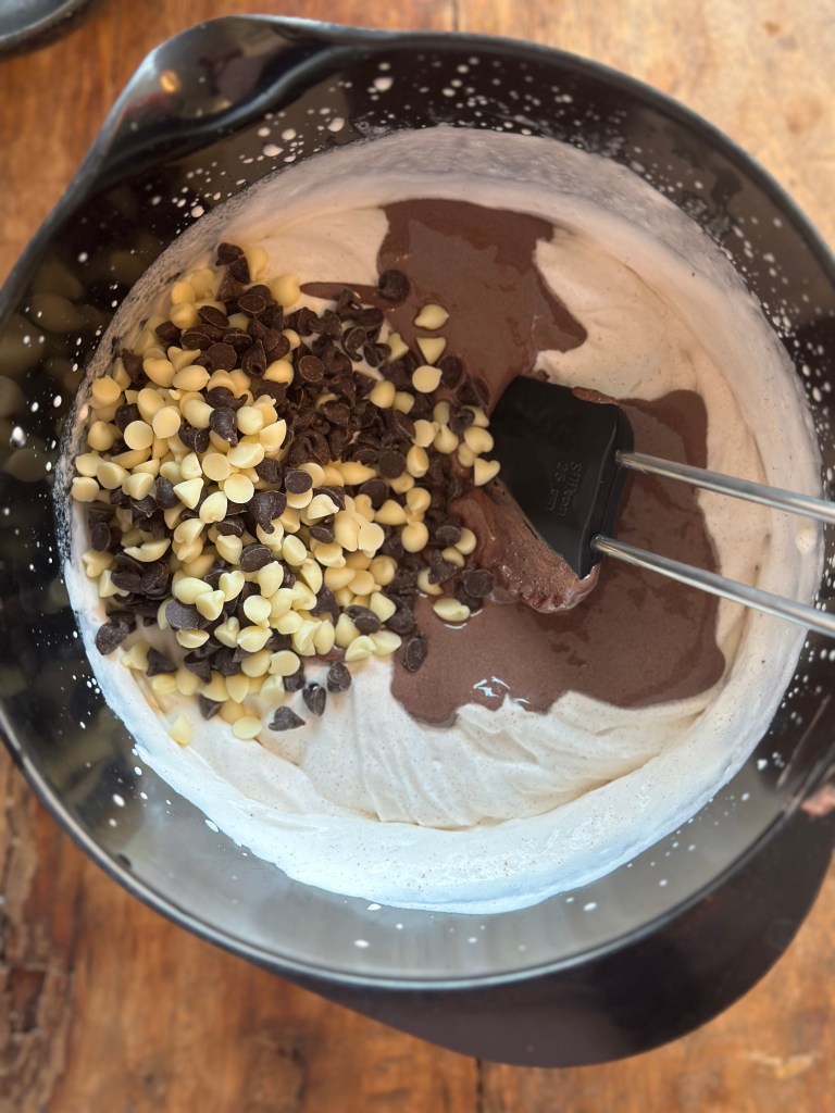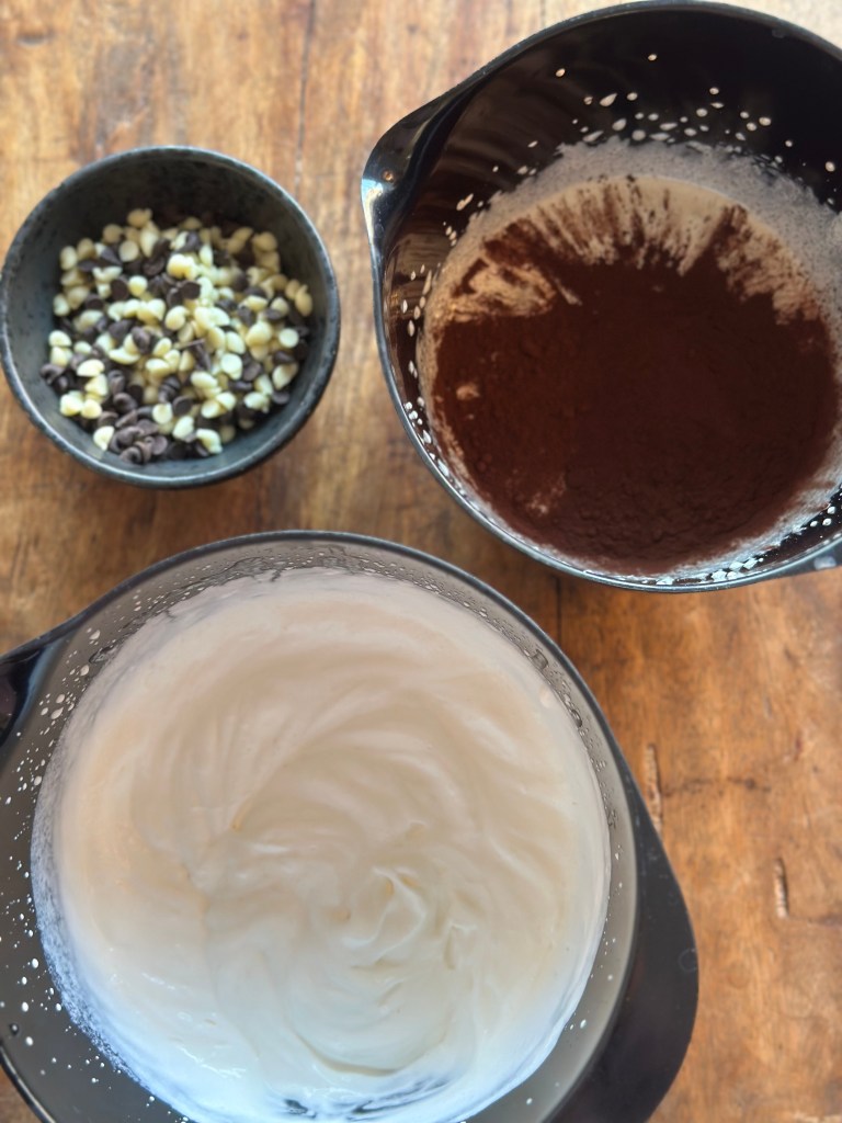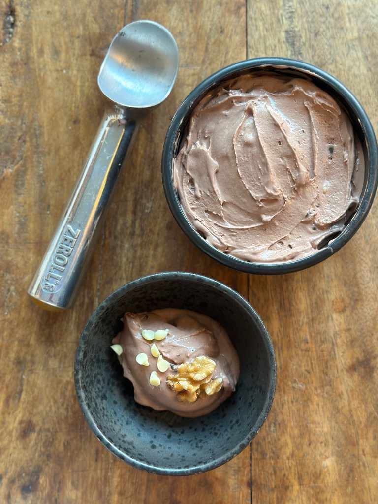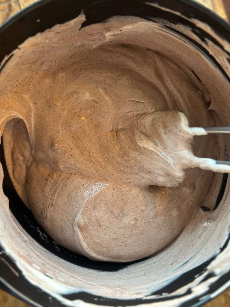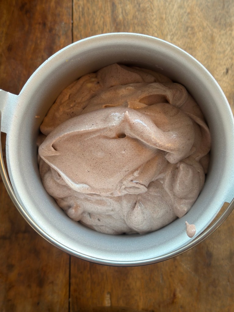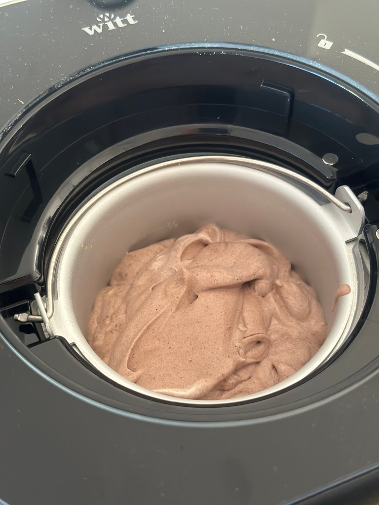 Pisker blommer og sukker luftigt i en skål, og fløden til flødeskum i en anden. Tilsætter kakao i æggesnapsen, og blander med flødeskummet. Jeg kommer herefter massen i min ismaskine og kører den i ca. 1 time. Herefter kommer den på frys, og tages op ca. 15 min før jeg skal bruge den.