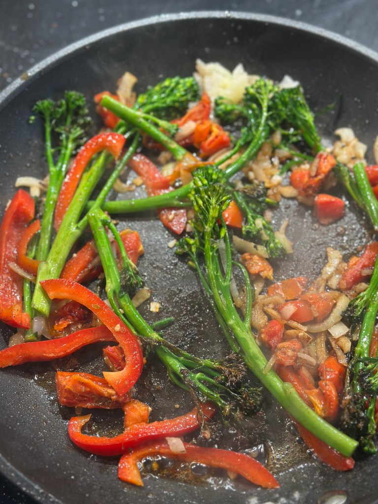 Broccolini bruger jeg hele, de øvrige ingredienser skærer jeg i små stykker. Alle ingredienser tilbereder jeg i olie, salt og peber, men ikke for meget.