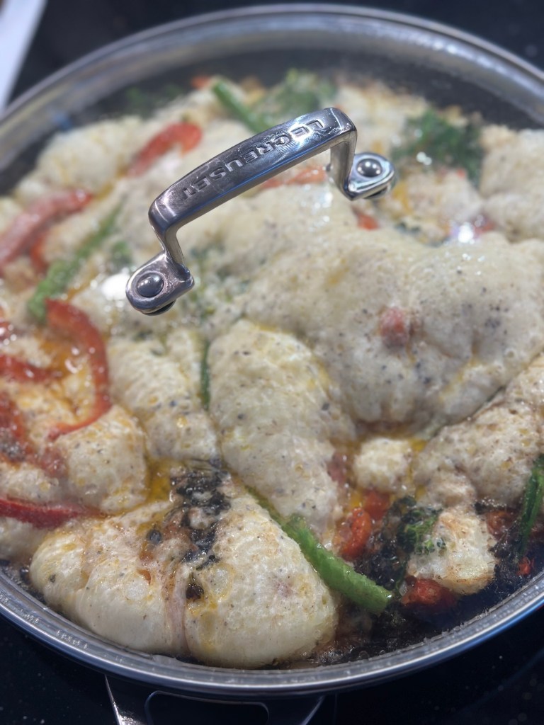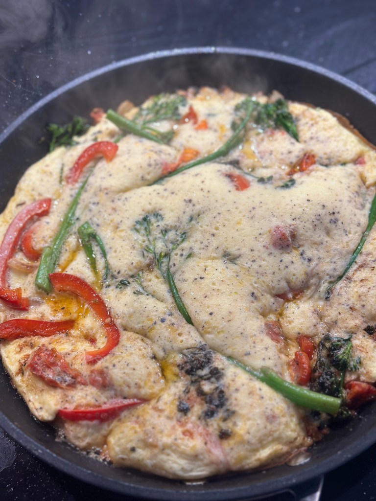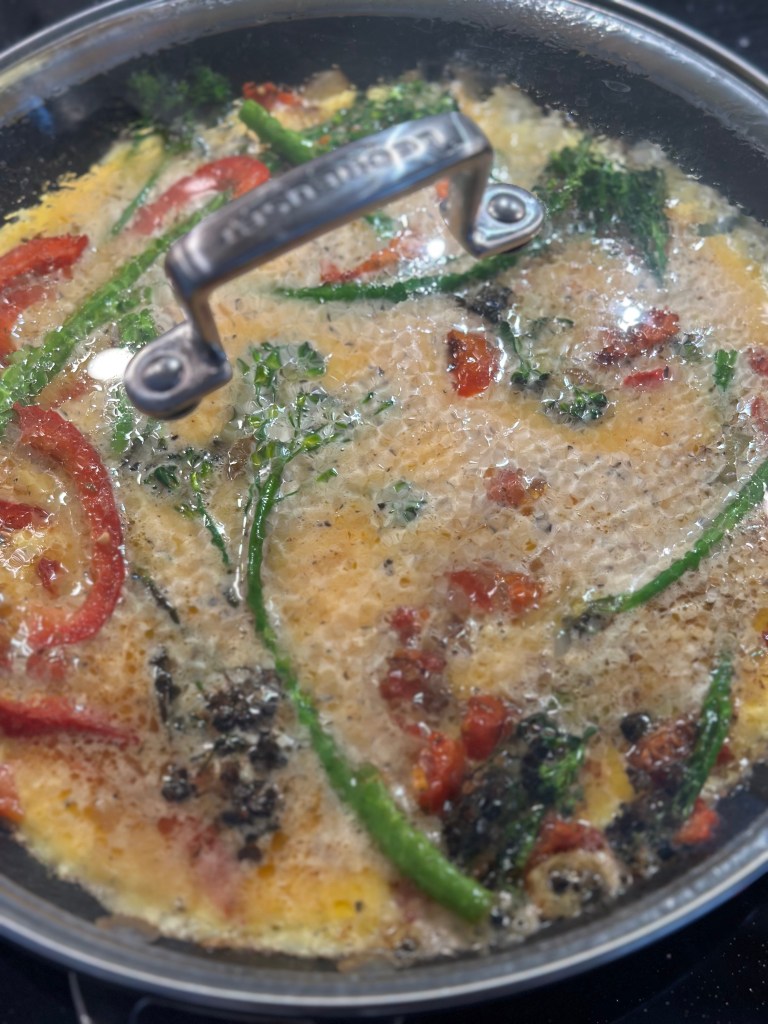 Jeg hælder æggemassen over, og lader bunde blive fast. Dette sker ved relativ høj varme. Så sætter jeg låg på, og skriver ned for varmen. Den puffer flot op og bliver luftig inden i.