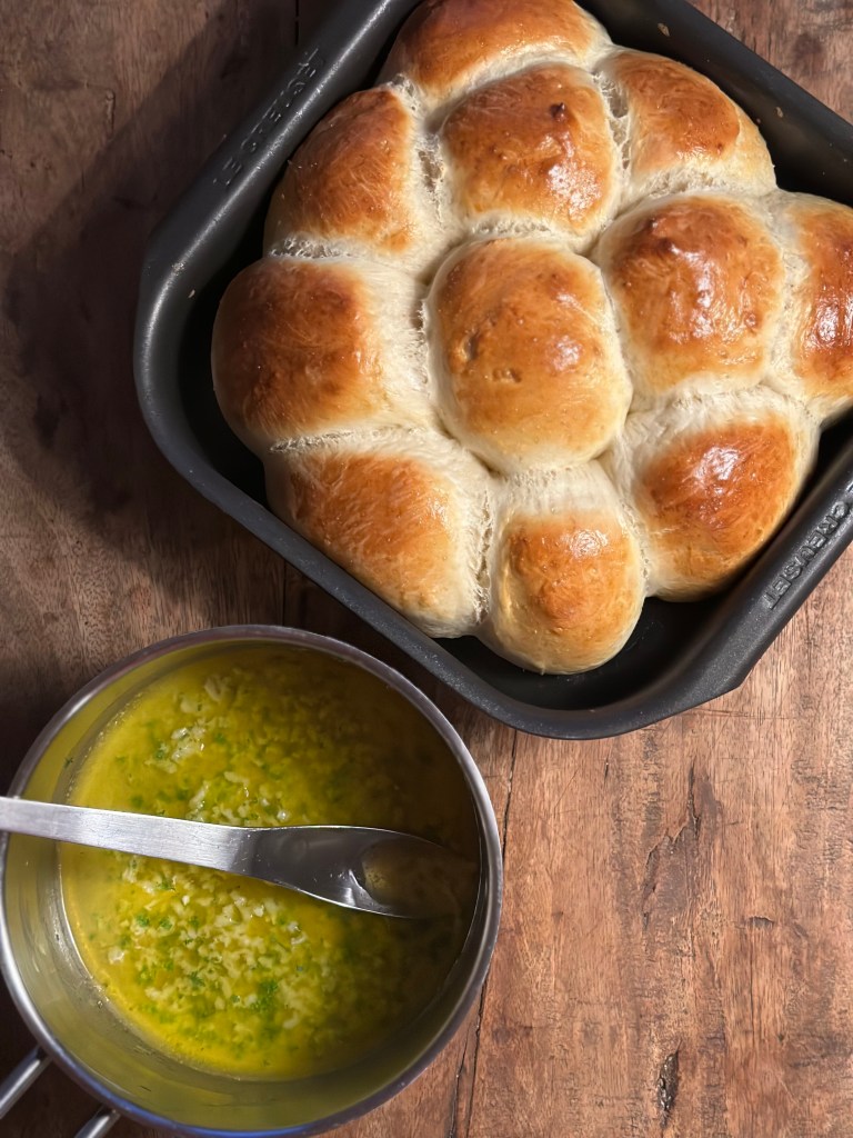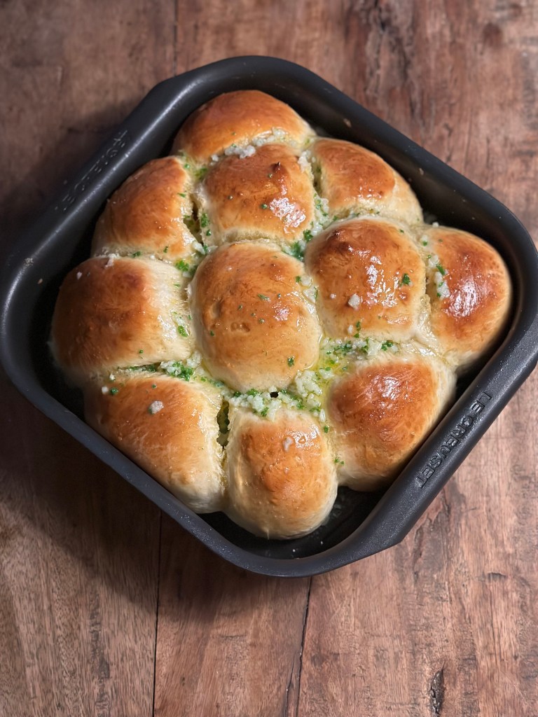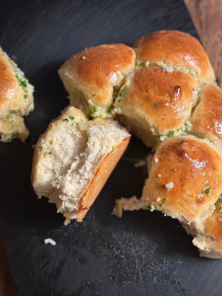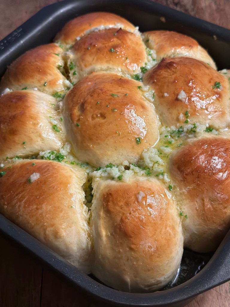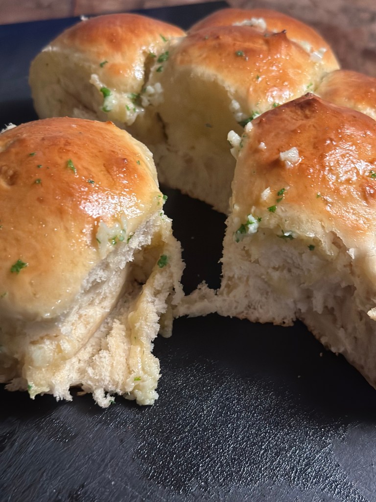 Smelt smĂžrret og pres hvidlĂžget i. Kom persillen i og bland godt. Kom blandingen over de varme boller, og kom ogsĂ„ ned i revnerne mellem bollerne.Â