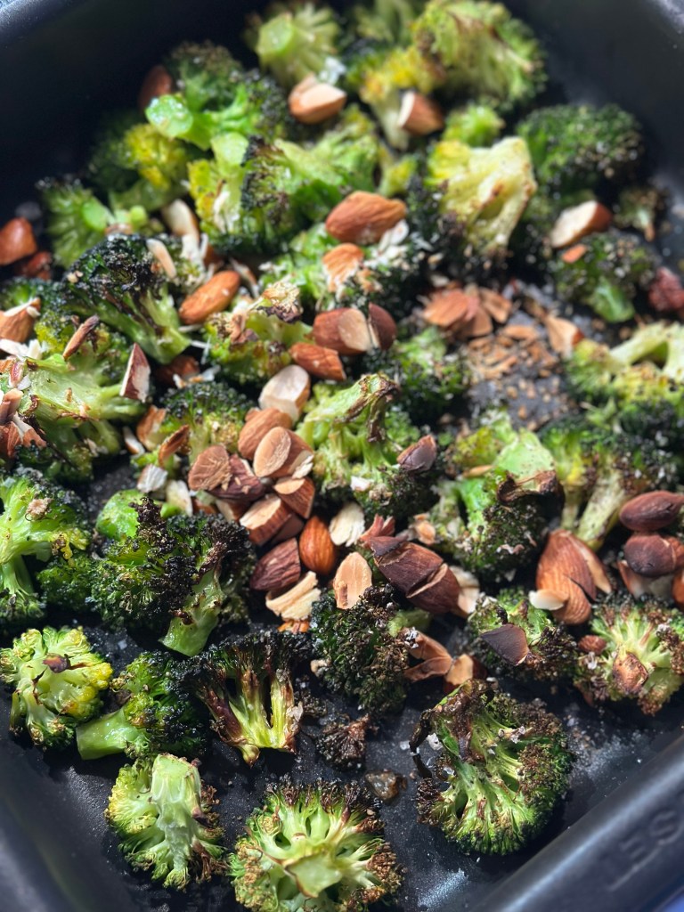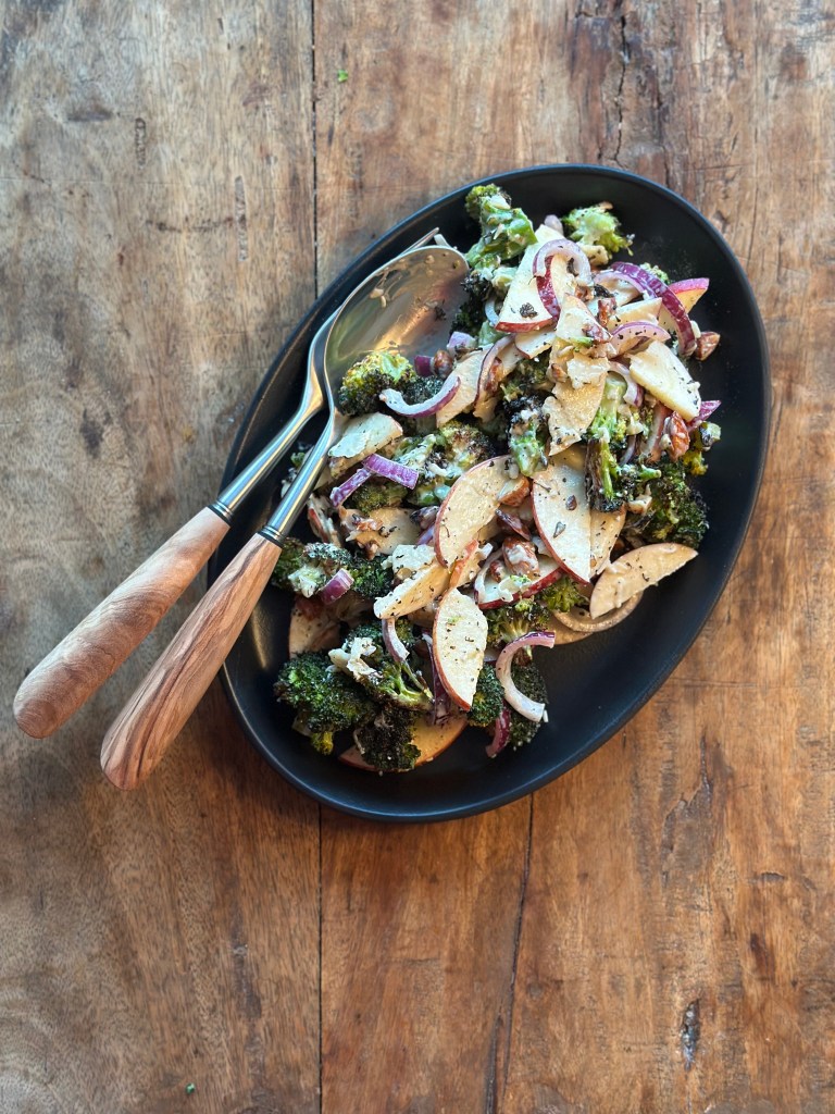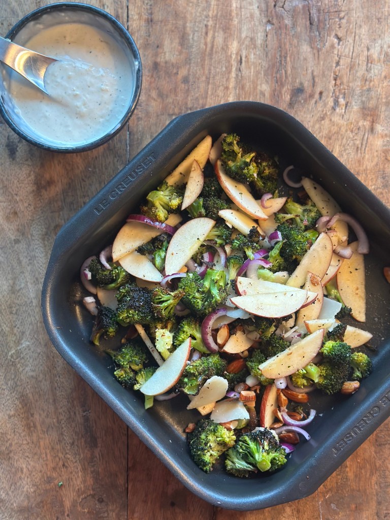 Jeg plukker broccolien i små stykker, samt hakker mandlerne groft. Blander det med olivenolie, salt og peber Kommer det ind i ovnen i ca. 20 minutter ved 250 grader – eller til broccolien har fået god farve (lidt sorte spots er perfekt). Lader det køle, og skærer æble i tynde både, samt løg i halve ringe. Kommer strimler at parmesan i.