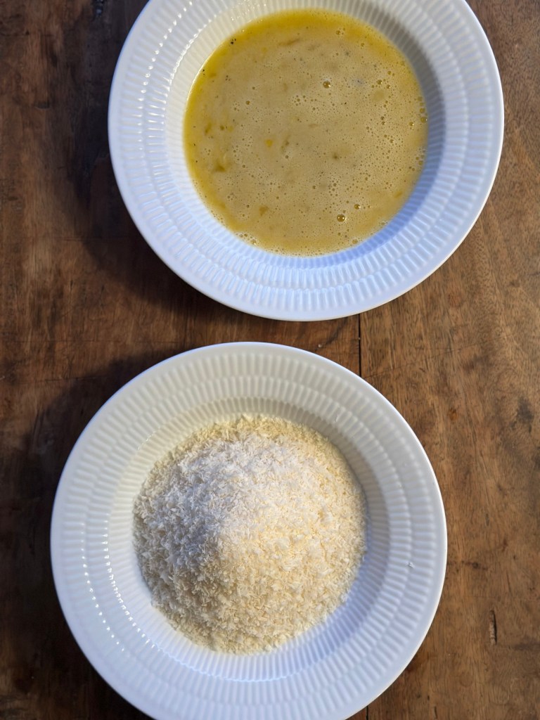 Pisk æg, saften fra en citron, revet hvidløg, peberkorn og salt godt sammen. Kom massen i en dyp tallerken. I en anden dyb tallerken kommer du panko raps.
