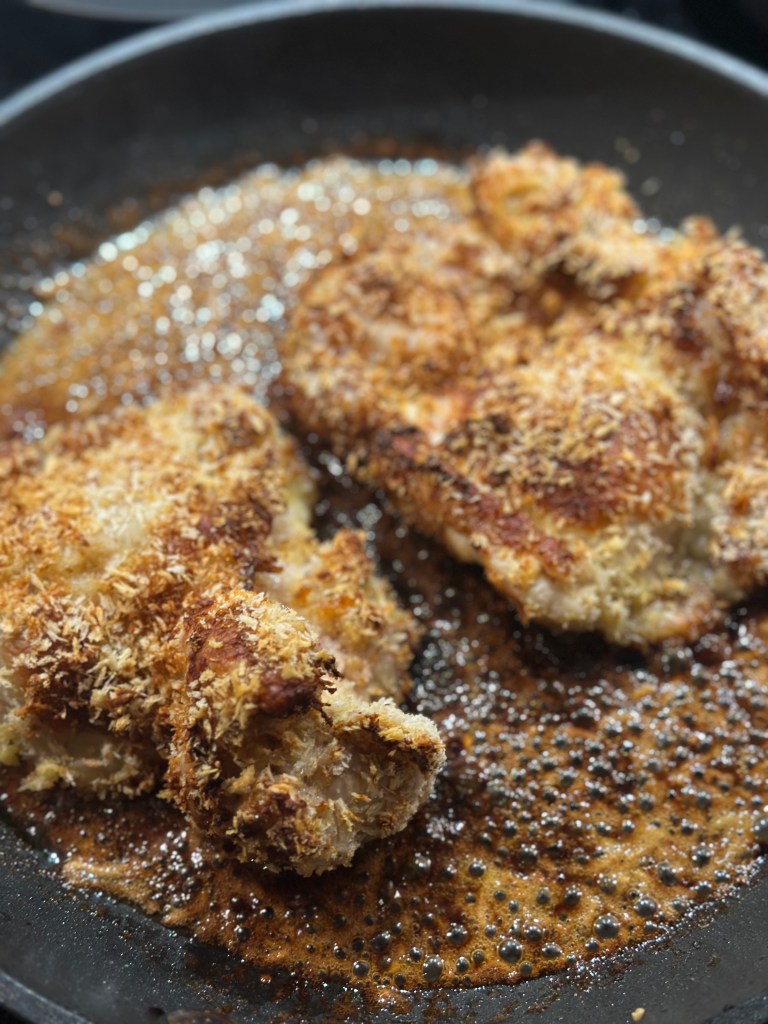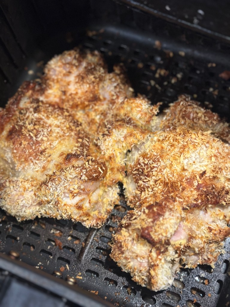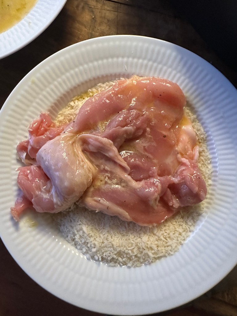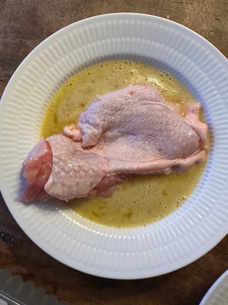 Vend kyllingen i æg massen og herefter i panko. Kom i airfryer i 25 minutter ved 200 grader. Og så er kyllingen klar til servering med den tilbehør du ønsker.