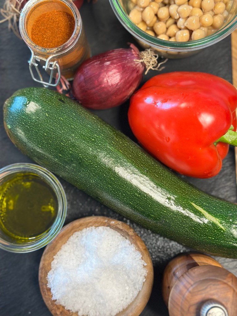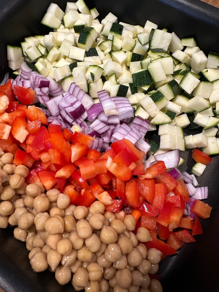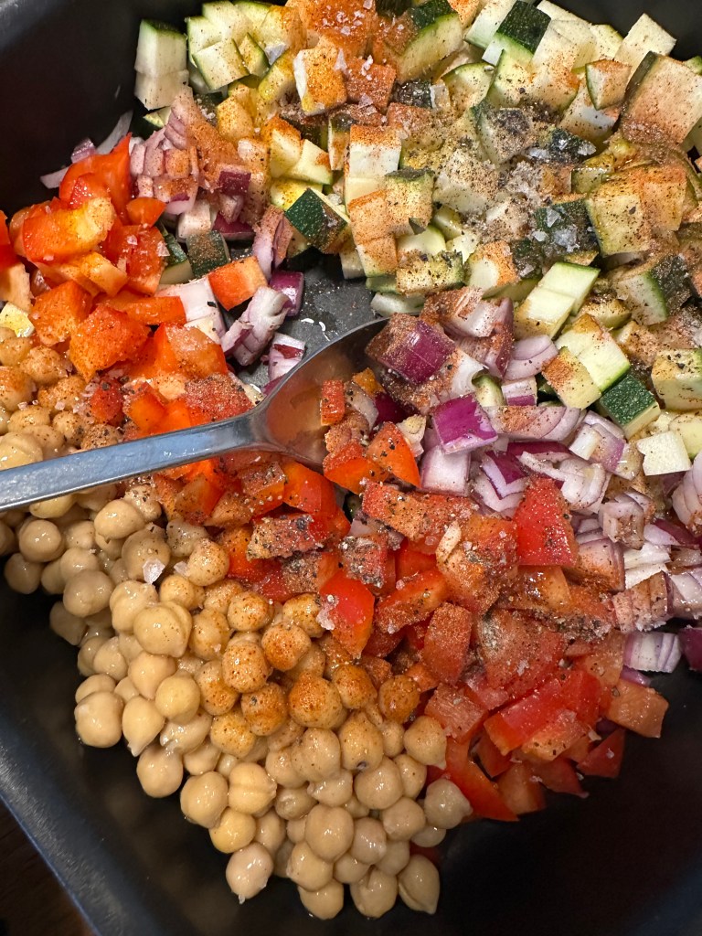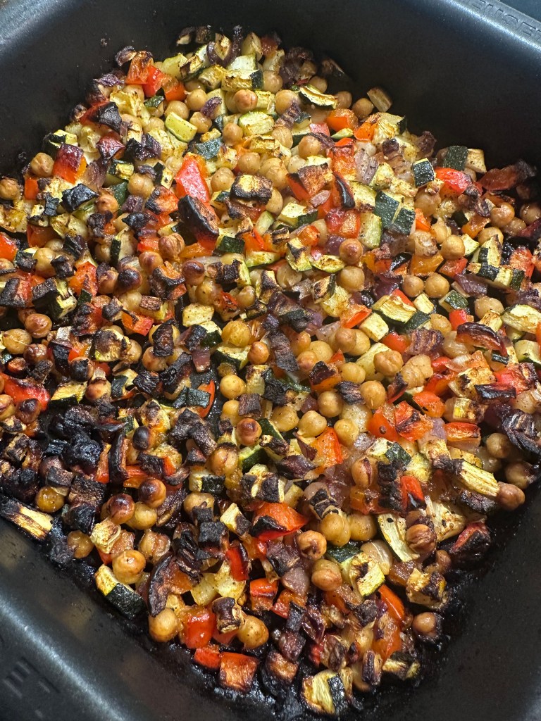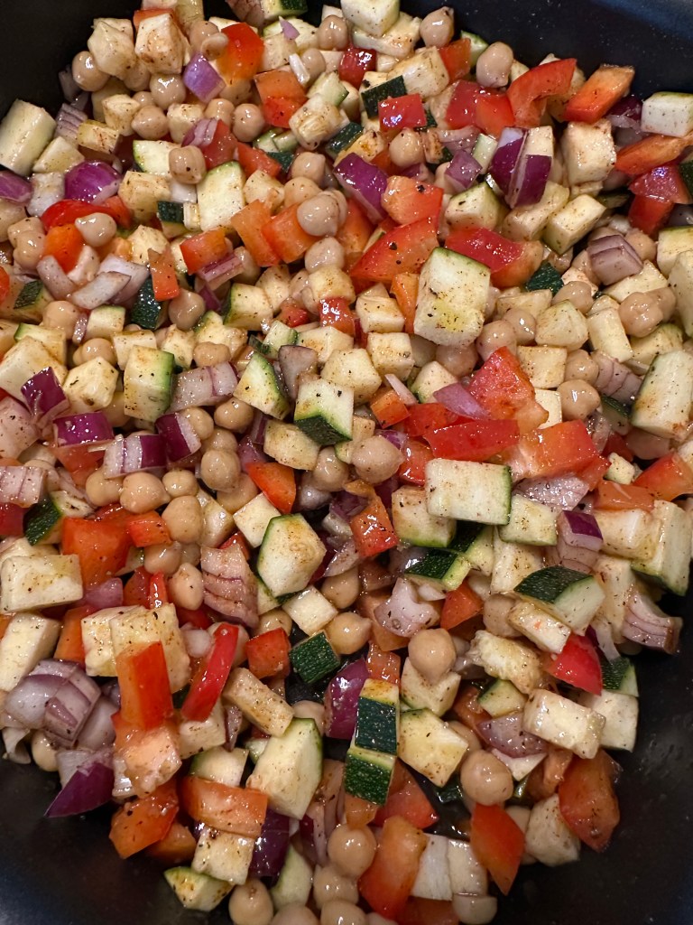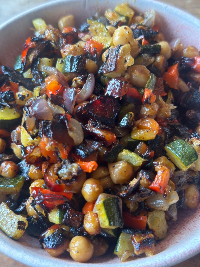 Alt skæres i næsten lige store tern (altså ikke kikærterne). Bland med olie og krydderier. Og sæt i ovnen ved 200 grader i ca. 20-25 minutter. Dette er en af de rettet, hvor du selv kan vælge resultatet. Jeg kan godt lide den lidt branket overflade, men du kan sagtens stoppe før – så hold øje med ovnen efter 20 minutter.