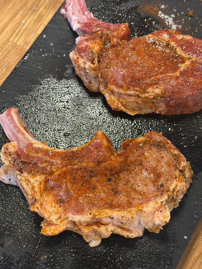 Jeg vælger kotelet på skaft, det synes jeg har mest smag og ser lækkert ud. Kødet skal have stuetemperatur, og krydres med: