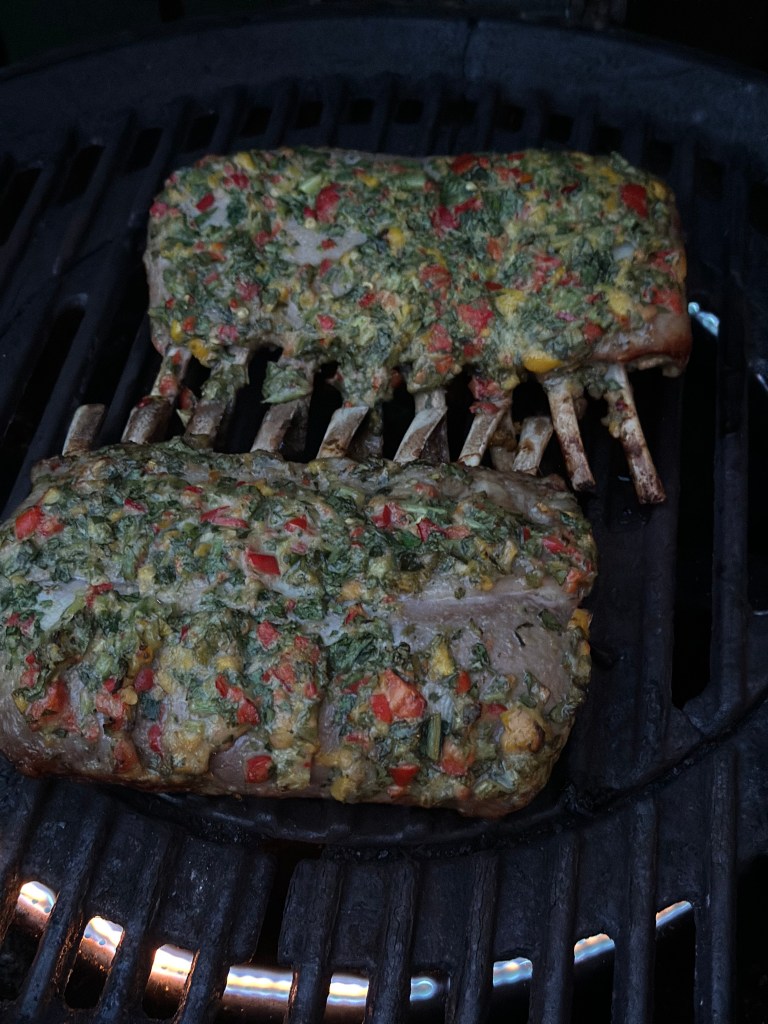 Fint hak den røde peberfrugt. Fjerne stilkene fra krydderurterne, og hak den fint. Kom hvidløg igennem en presse – bedre end at rive i dette tilfælde. Bland sammen med saften fra en citron og yoghurten. Smør lammekronen ind i marinaden og læg i en pose og på køl i nogle timer.