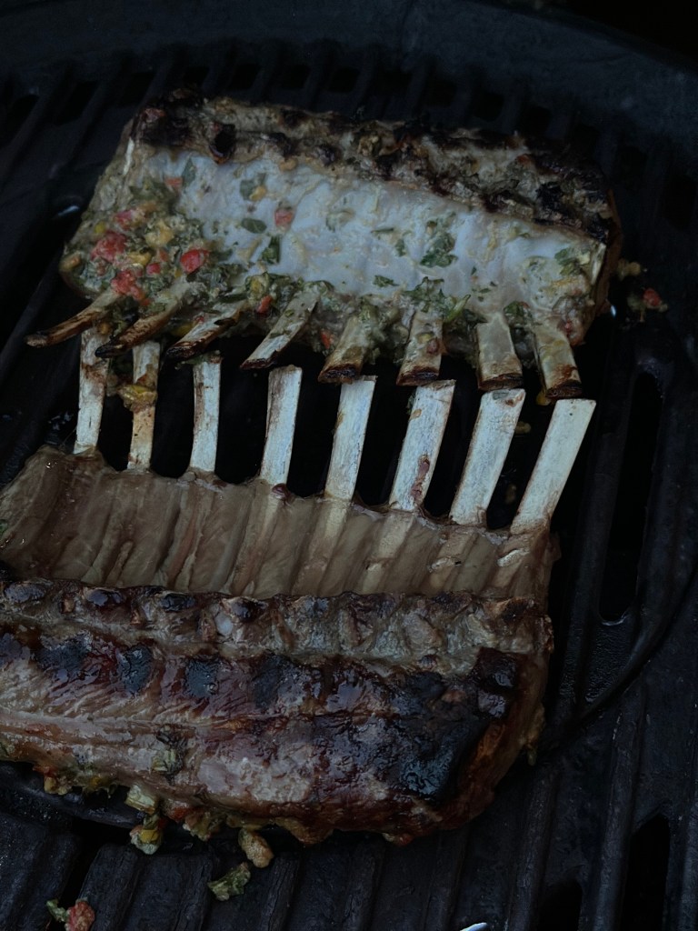 Steg på grillen – første del med 10 minutter på hver side i inddirekte varme, og slut af med med 2-3 minutter på hver side med direkte varme. Det er bedst, hvis lam er let rosa indeni (ca. 58-60 °C kernetemperatur). Lad den hvile lidt, inden du skærer den ud.