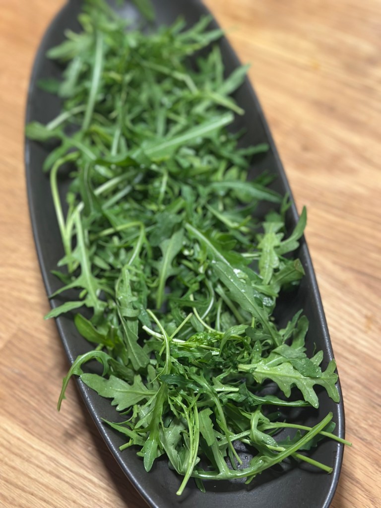 Rucola, også kendt som arugula eller roquette. Rucola er en bladgrøntsag, der er kendt for sin karakteristiske, peberagtige smag. Rucola har lange, spinkle blade med dybt indskårne kanter. Bladene er normalt mørkegrønne og kan variere i form og størrelse.