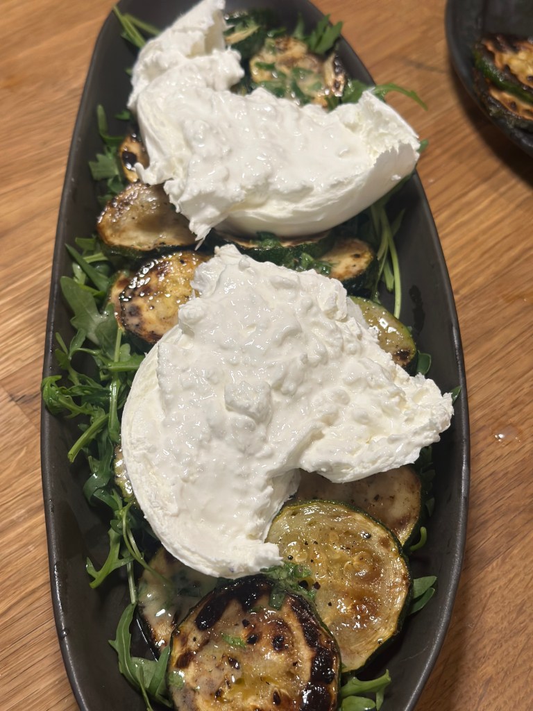 Det hele blandes godt, og kommes over salaten i alle lag – rucola, zucchini samt burrata.