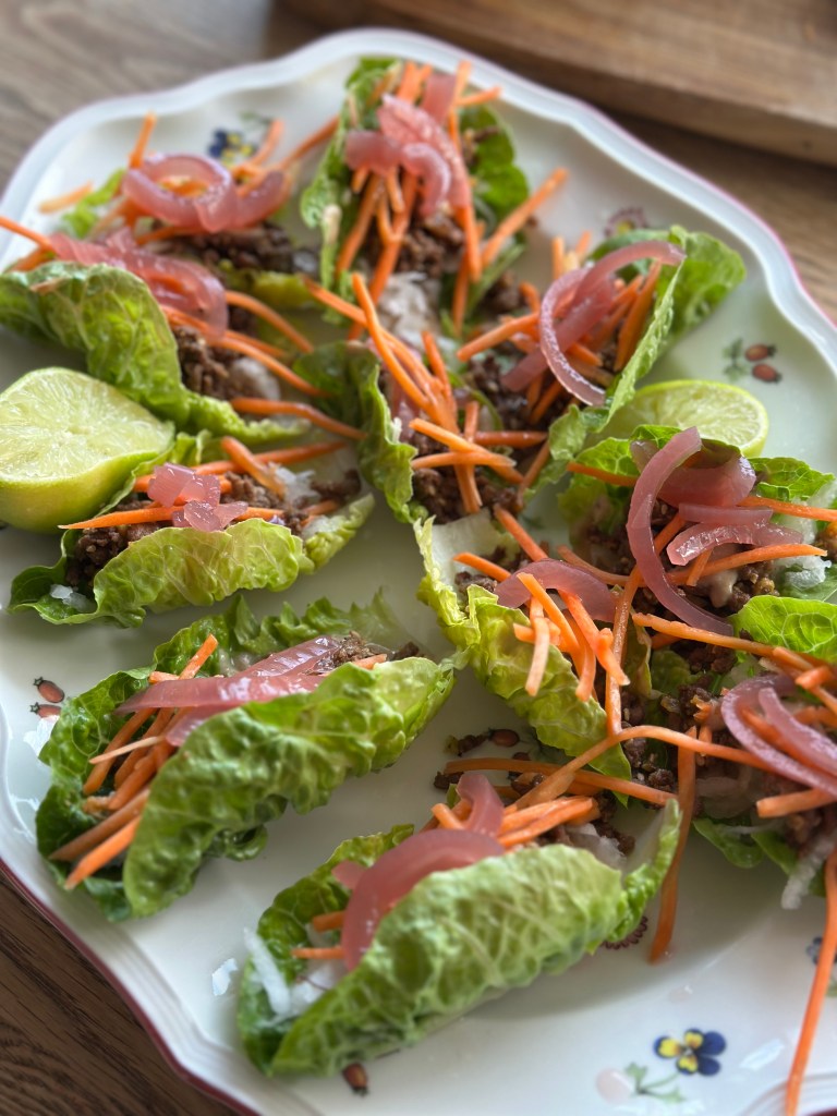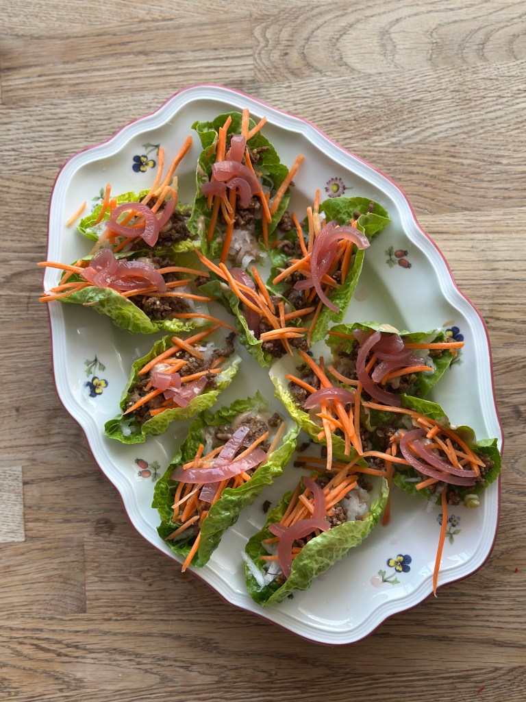Monteres i Hjertesalatblade med peanutsauce i bunden, dernæst asian beef og kinaradise. Pyntes med syltet rødløg og revet gulerødder. Toppet med lime.