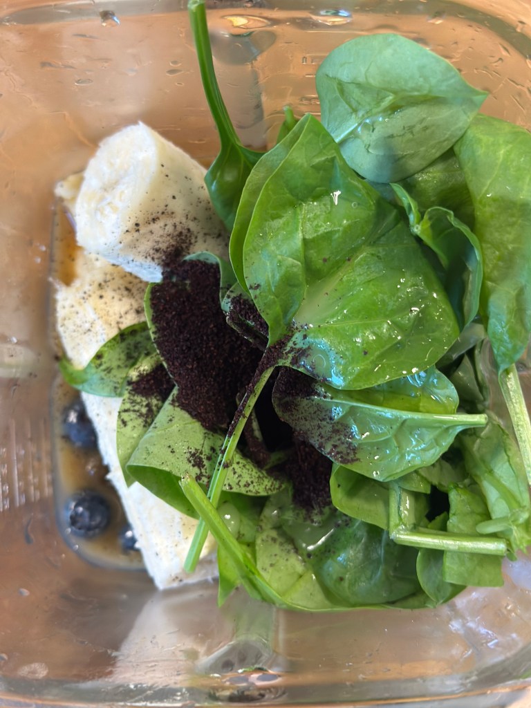 Det hele i en blender, og drikkes kold. Den skiller lidt, men det gør ikke noget – det er ingredienserne som ikke alle vil binde til hinanden, men hverken smag eller konsistens er påvirket.