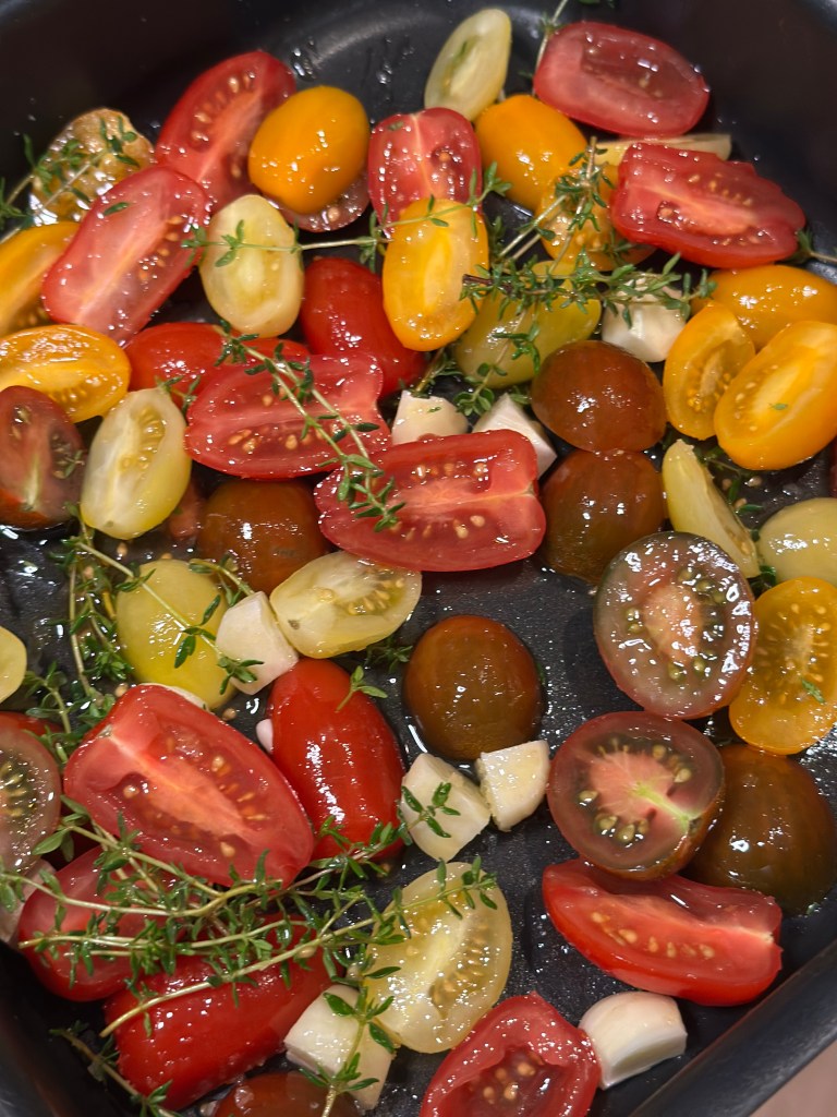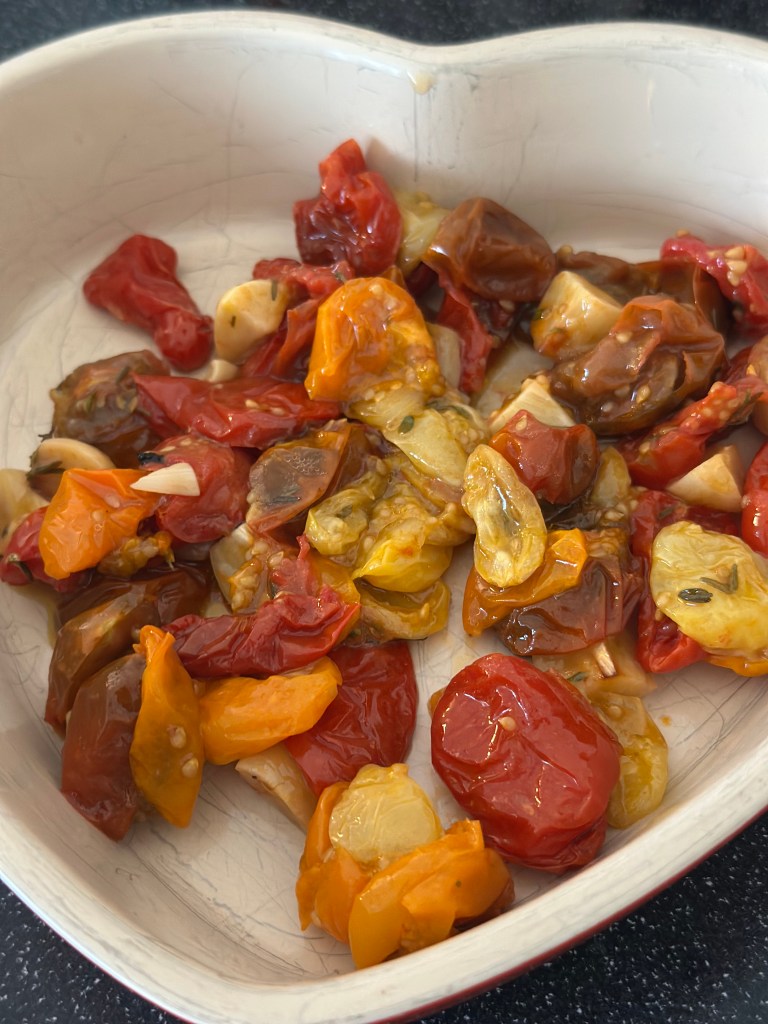 Det er en bund af bagte cherry tomater. hvidløg, timian og olivenolie. Krydret med salt og peber. I ovnen ved 100 grader i halvanden time. Tag dem og, og fjern de værste stilke.