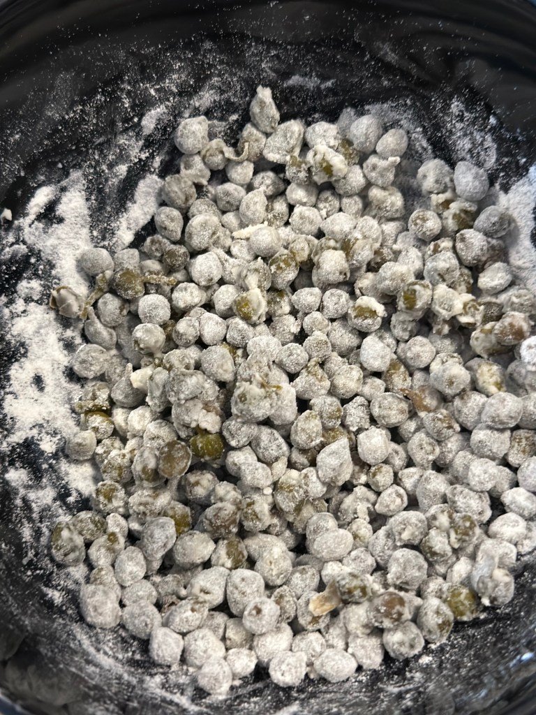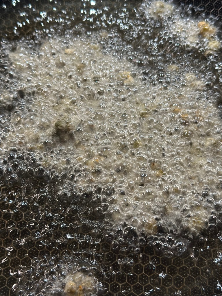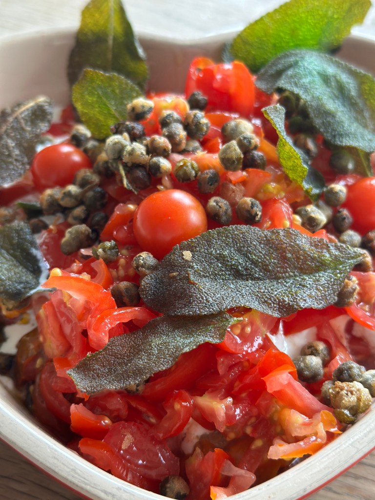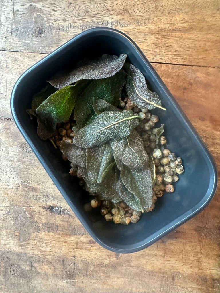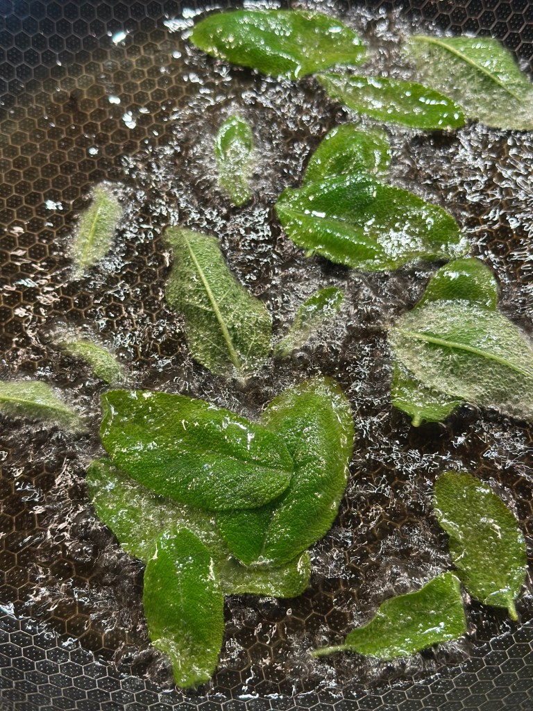 Som toppen skal der friteret små kapers og salvie blade. Kapers vendes i hvedemel først, men salvie bladende kommer blot i olien. Jeg vælger Solsikkekerne olie.