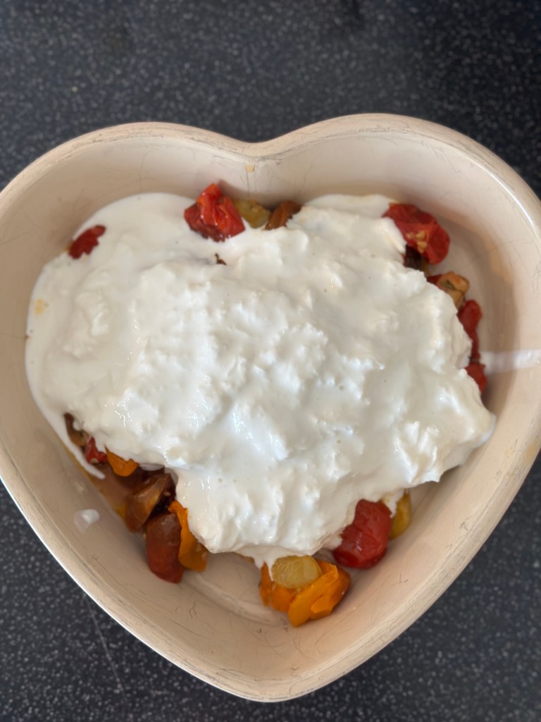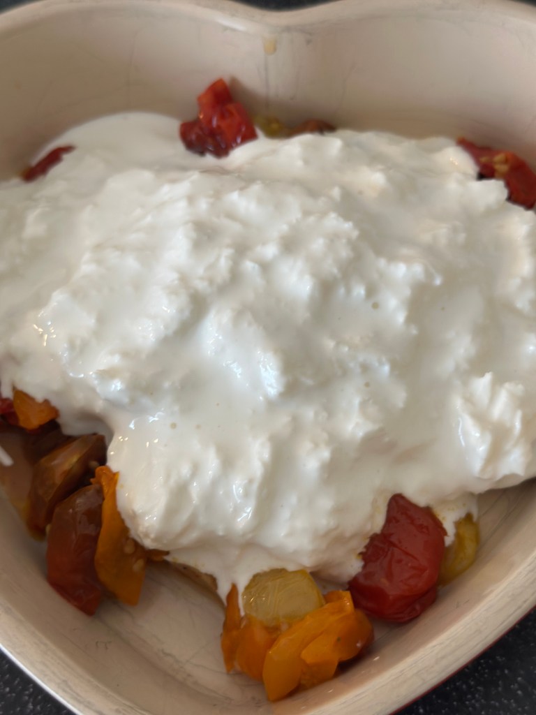 Ovenpå stracciatella, kommer man fint hakkede tomater, og krydret med salt, friskkværnet peber og olivenolie.