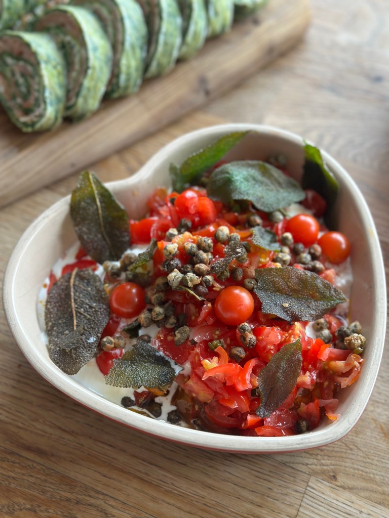 Denne lette italienske ret, er inspireret af Restaurant Tramonto i Carlsbergbyen, som jeg har besøgt flere gange. Den er med på deres forrets kort. Det er et fantastisk sted med god mad, og god service – og så kan man sidde foran køkkenet, og følge med i at ens ret bliver tilberedt.