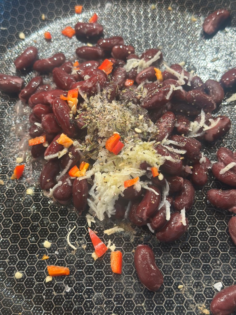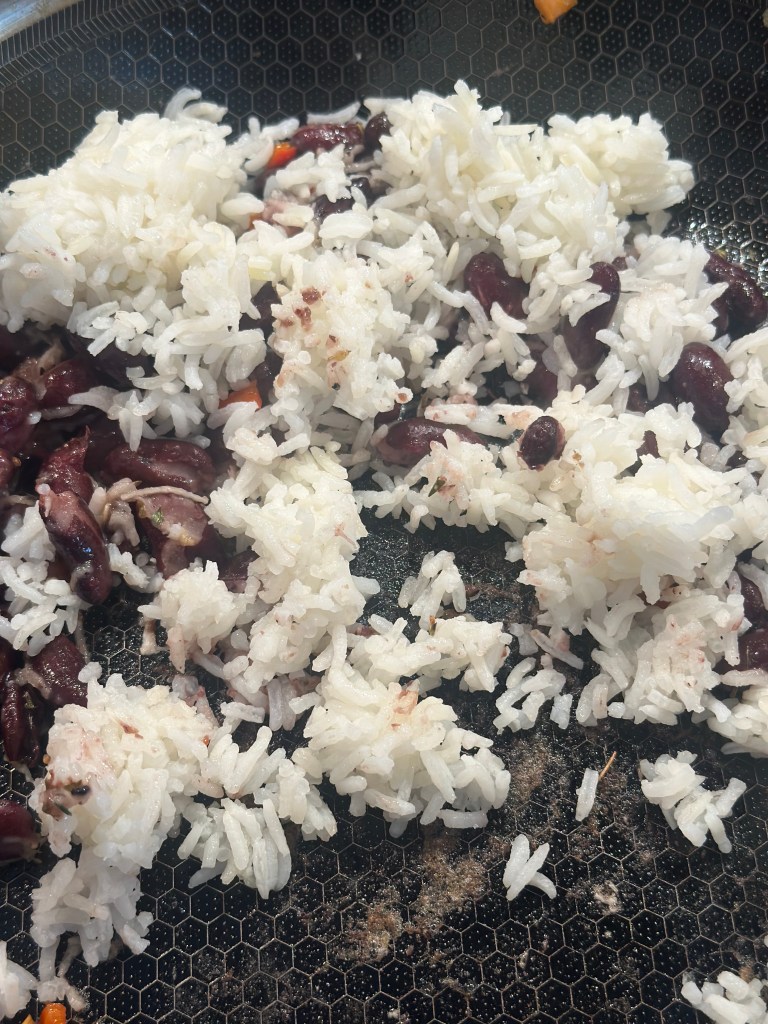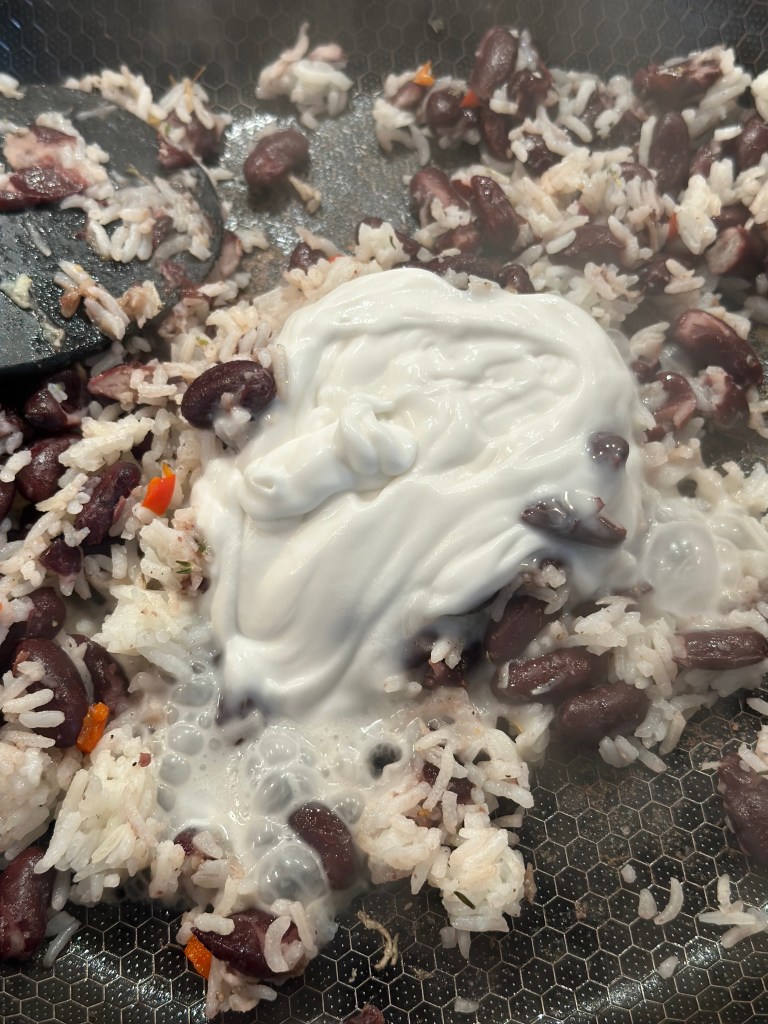 På en pande steger du kidneybønnerne i olivenolie sammen med krydderierne. Kom risene sammen med på panden, og tilsæt kokusmælken. Smag til med lime, salt og peber.