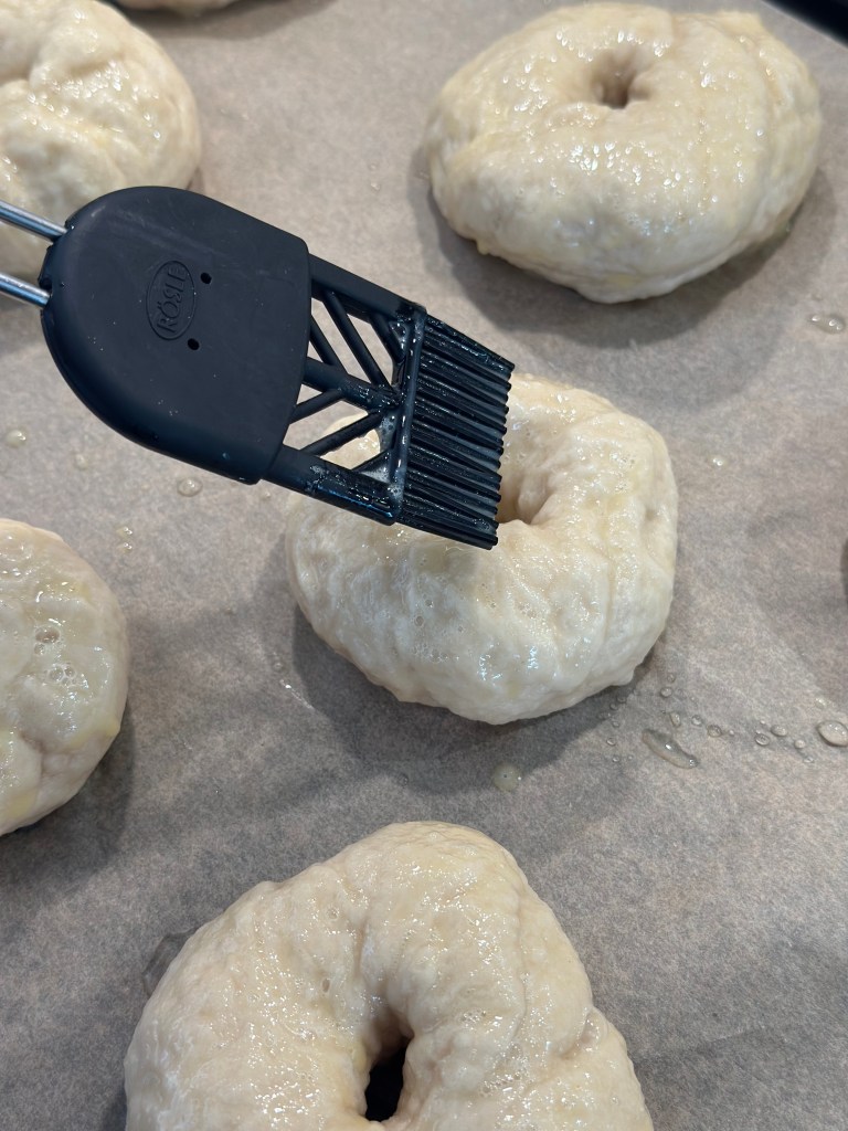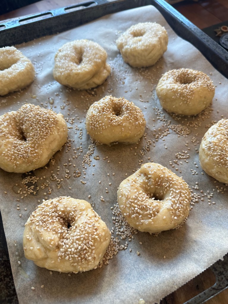 Sæt en stor gryde over med vand. Når vandet koger tilsættes salt og 1 spsk natron – og vandet noget op. Kog 4-5 bagels af gangen og vend den efter 1 minut. Læg dem direkte på bagepladen, og pensel med shaker æg. Jeg har pyntet med sesamfrø som er den klassiske, og svensk sukker. Men du kan pynte som du vil. Sesamfrø giver den klassiske smag.