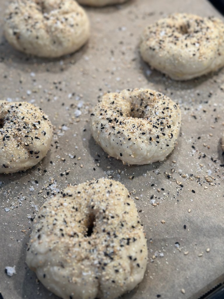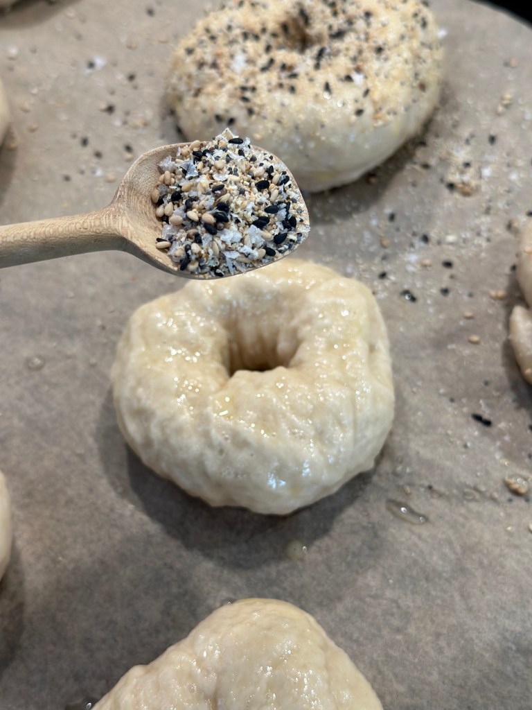 Denne variation er mine sønners yndlings. Det er den samme bagel, men topping er en blanding af en masse – heraf navnet “everything”.