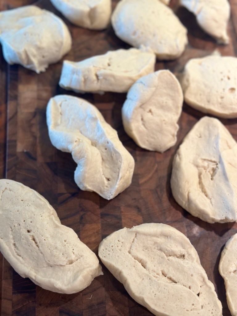 Ælt herefter dejen i hånden, og del den i 16 lige store stykker.