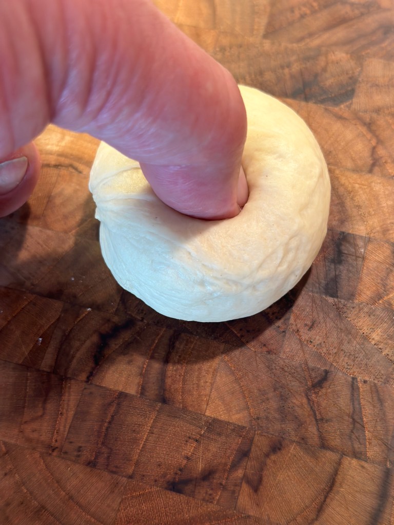 Brug en let hånd og rul hvert stykke helt rundt mod bordpladen. Når den er helt rund og glat – og gå ikke på kompromis her, så tik tommelfingeren igennem i midten. Skift over til pegefingeren og drej rundt i luften. Hullet skal være pænt større end du først tænker, da bagel hæver på indersiden også.